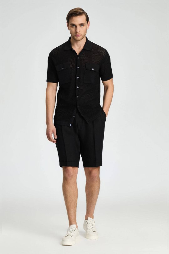 Keten Pamuk Karışım Kısa Kollu Siyah Triko Gömlek