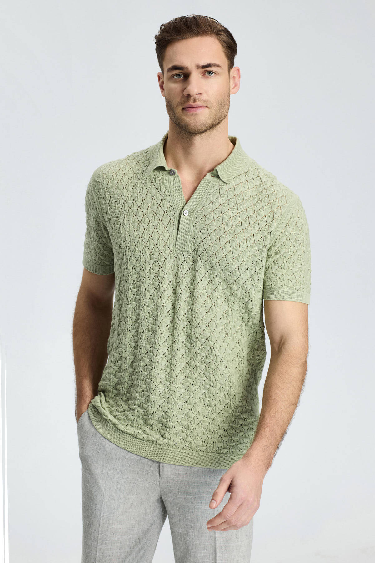 Ajur Örgü Detaylı Saf Pamuk Yeşil Triko Polo