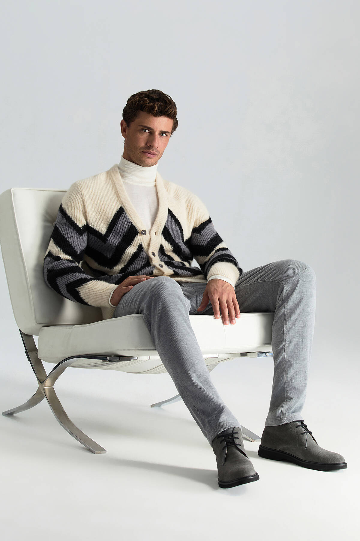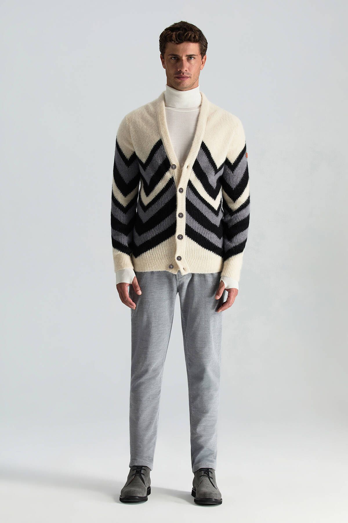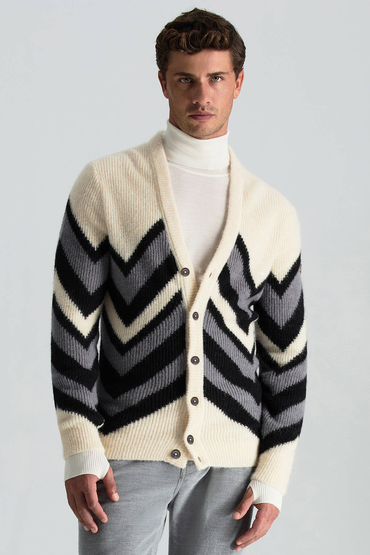 Alpaka Yün Kaşmir Karışım Zigzag Desen Bej Gri Düğmeli Hırka