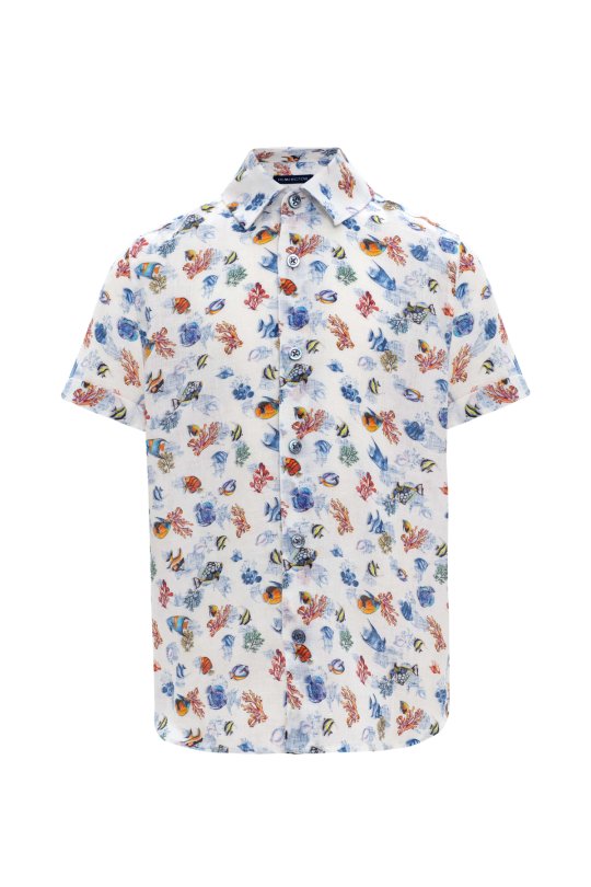 Balık Desen Saf Keten Beyaz Kısa Kollu Çocuk Gömlek
