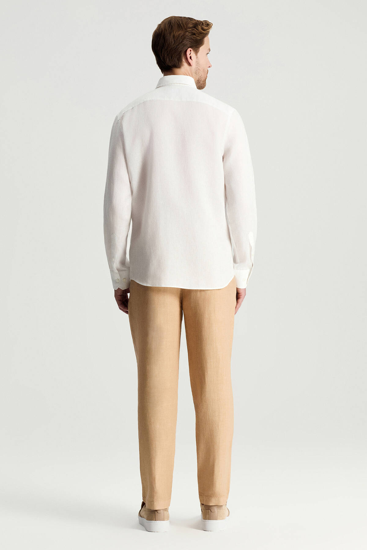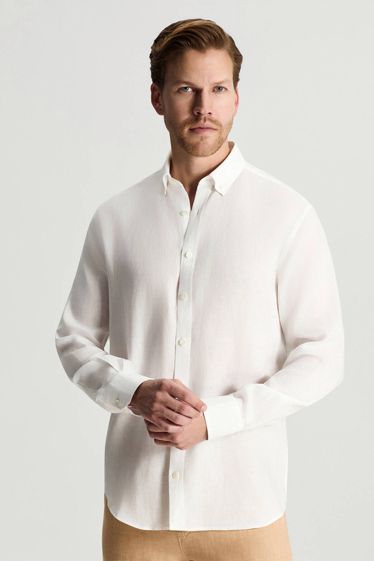 Düğmeli Yaka Saf Keten Beyaz Gömlek