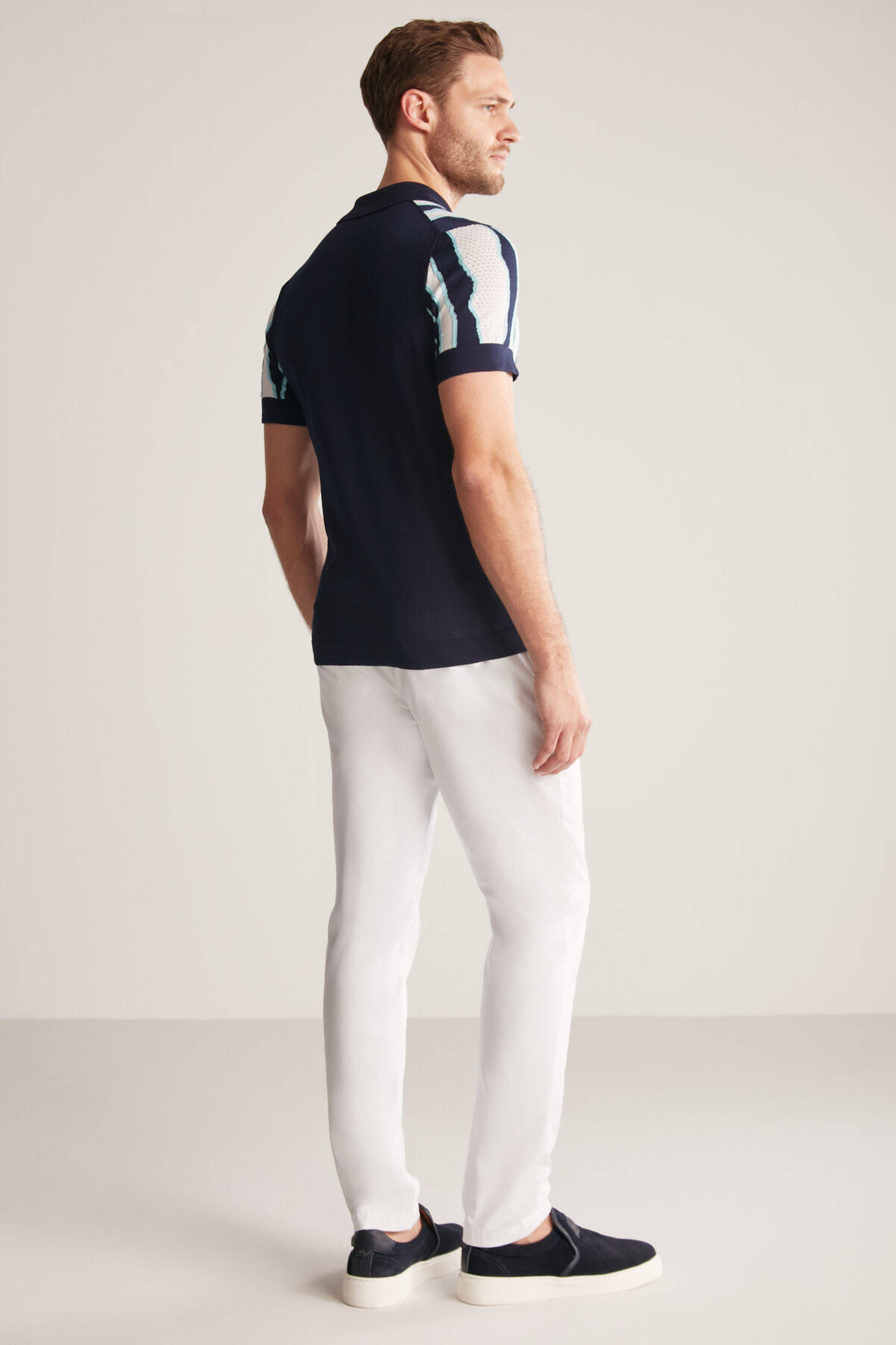 Çağdaş bir tabloyu andıran çarpıcı deseni ve etkileyici renk kombinasyonu ile fark yaratan çizgi desenli lacivert-beyaz triko poloyu keşfedin. Özgün dokusu, nefes alan yüzeyi ve renklerini uzun süre koruyan yapısı ile bir doğa harikası olan İtalyan Giza pamuğundan üretilen bu şık parça, Hemington’a özgü ayrıcalıklı triko işçiliği ile de seçkin giyim zevkine hitap eder.