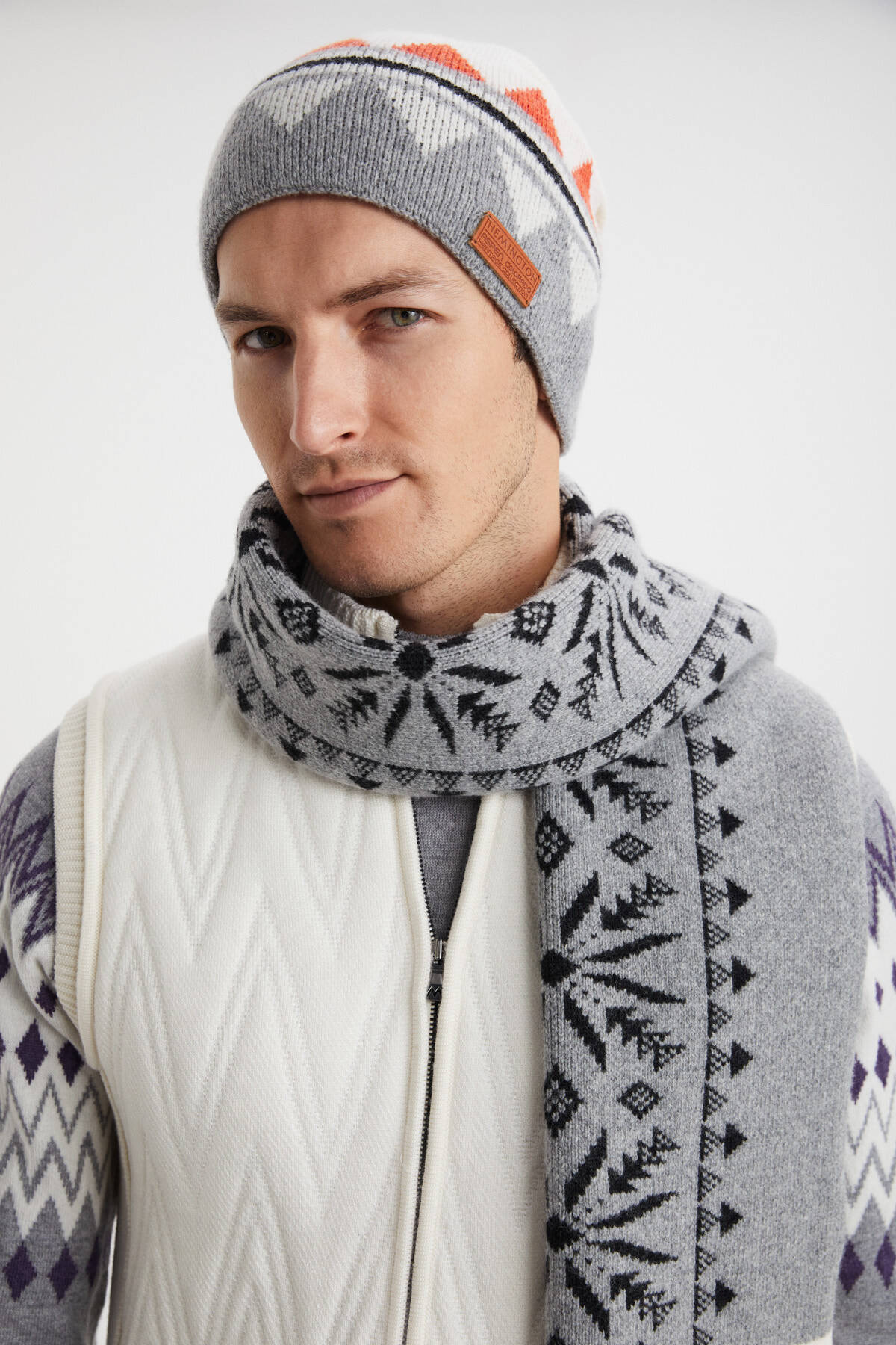Kış sezonuna çok yakışan Aspen stilindeki deseni ile dikkat çeken gri bere, kaşmirli yün karışımlı sürdürülebilir elyaf içeriği ile sıcacık bir kış vadediyor. İnsan teniyle uyumlu yumuşak dokusu ve en soğuklarda dahi ideal ısı yalıtımı sağlayan kaşmirli yün içeriği ile çok konforlu olan desenli gri bereyi, takımı olan atkı ve kazakla kombinleyebilirsiniz.