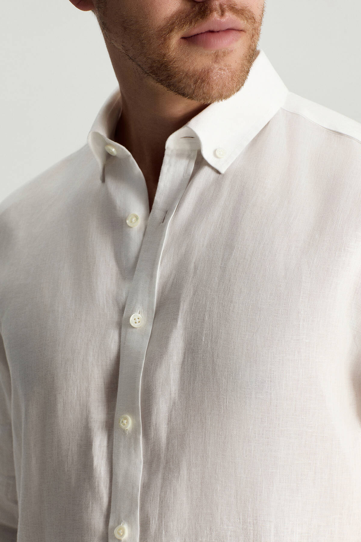 Düğmeli Yaka Saf Keten Beyaz Gömlek