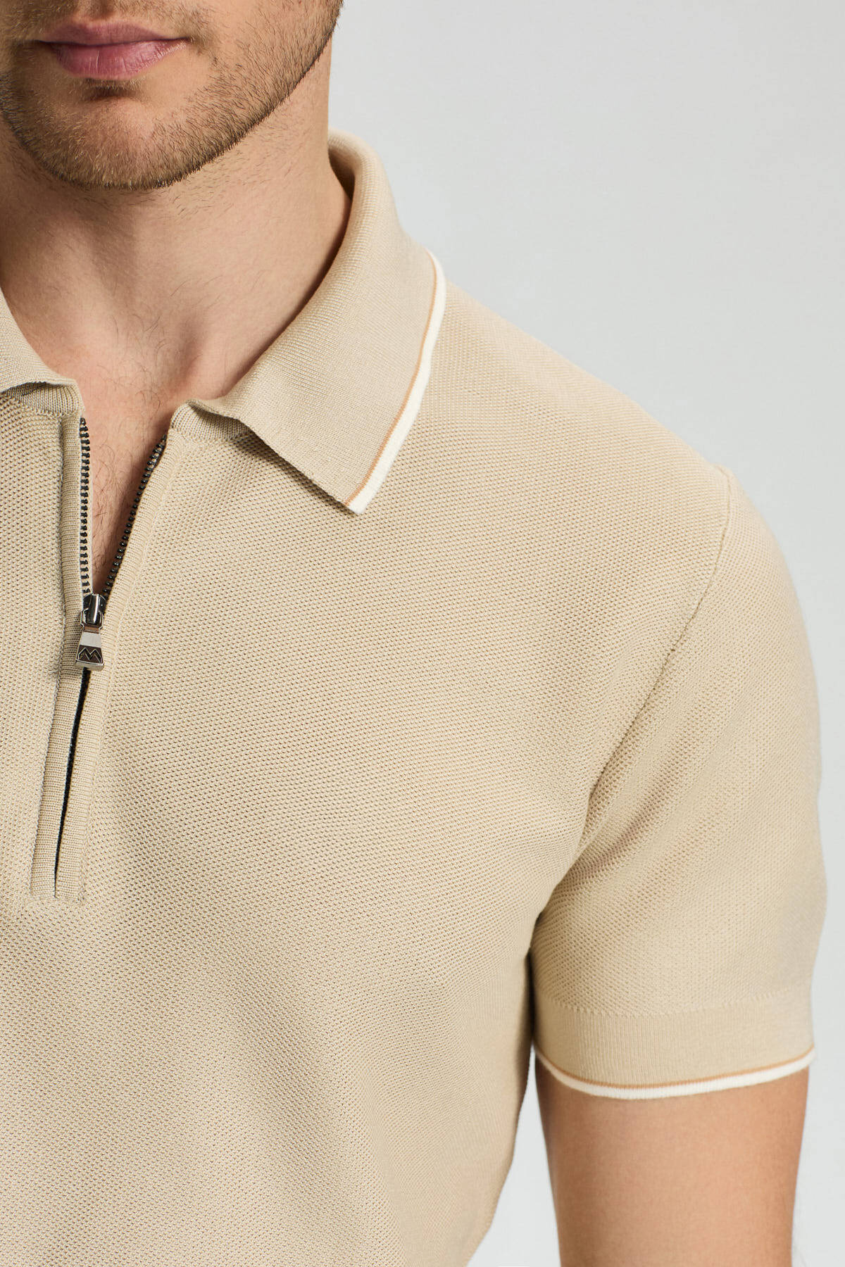 Fermuar Detaylı Bej Merserize Pamuk Triko Polo