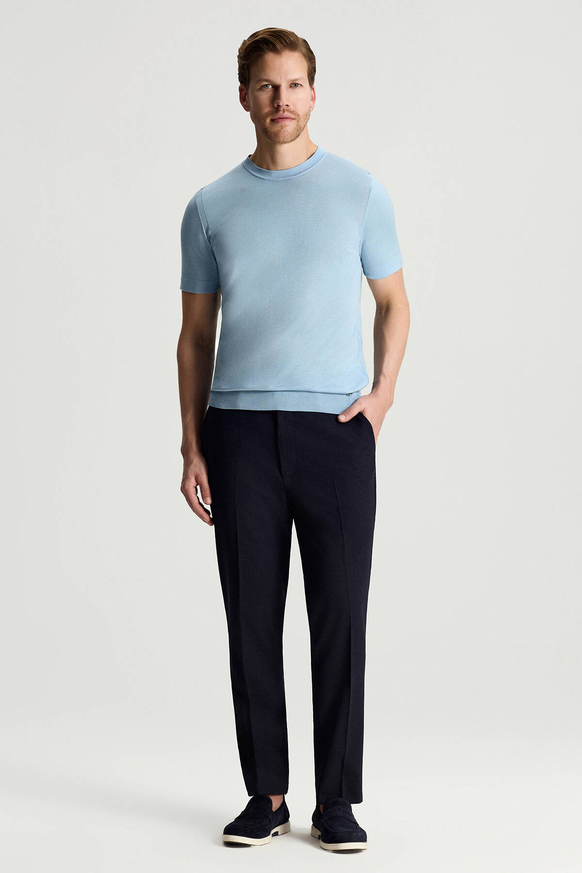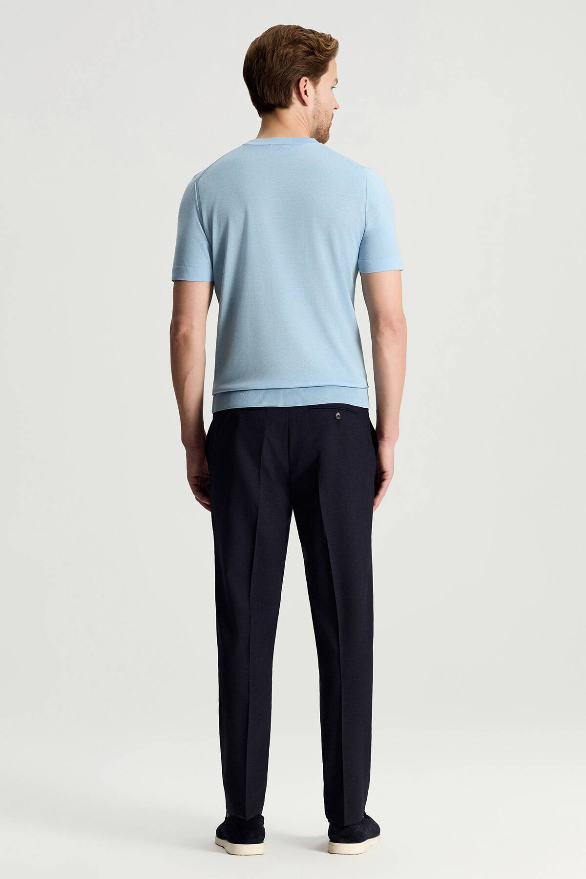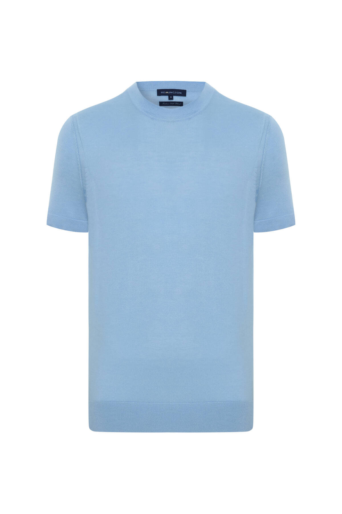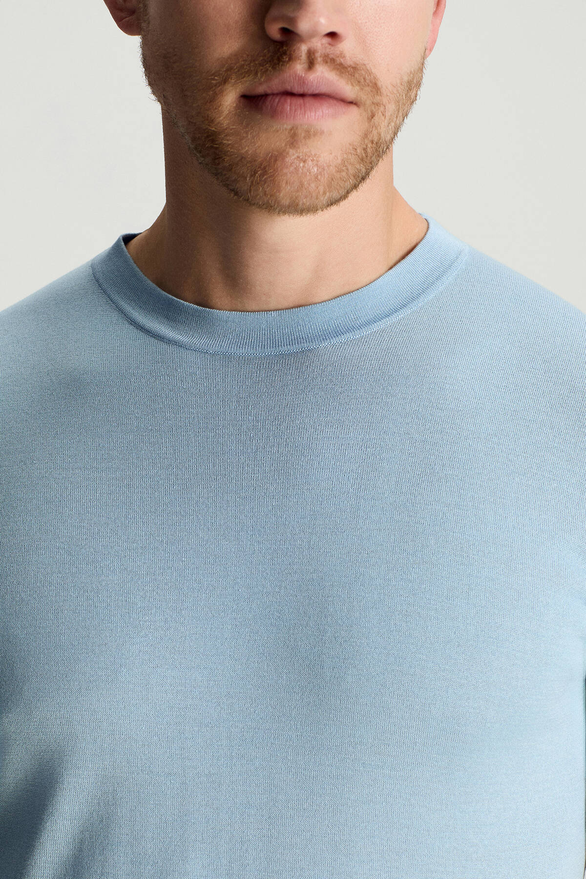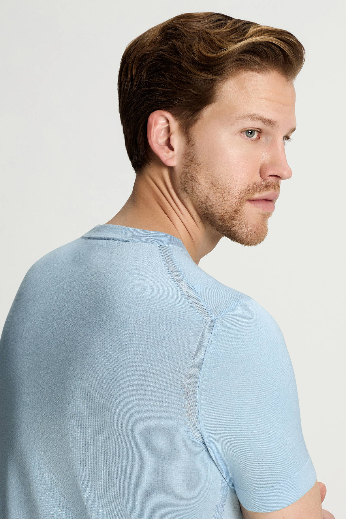 İpek Karışımlı Bisiklet Yaka Açık Mavi Triko T-Shirt