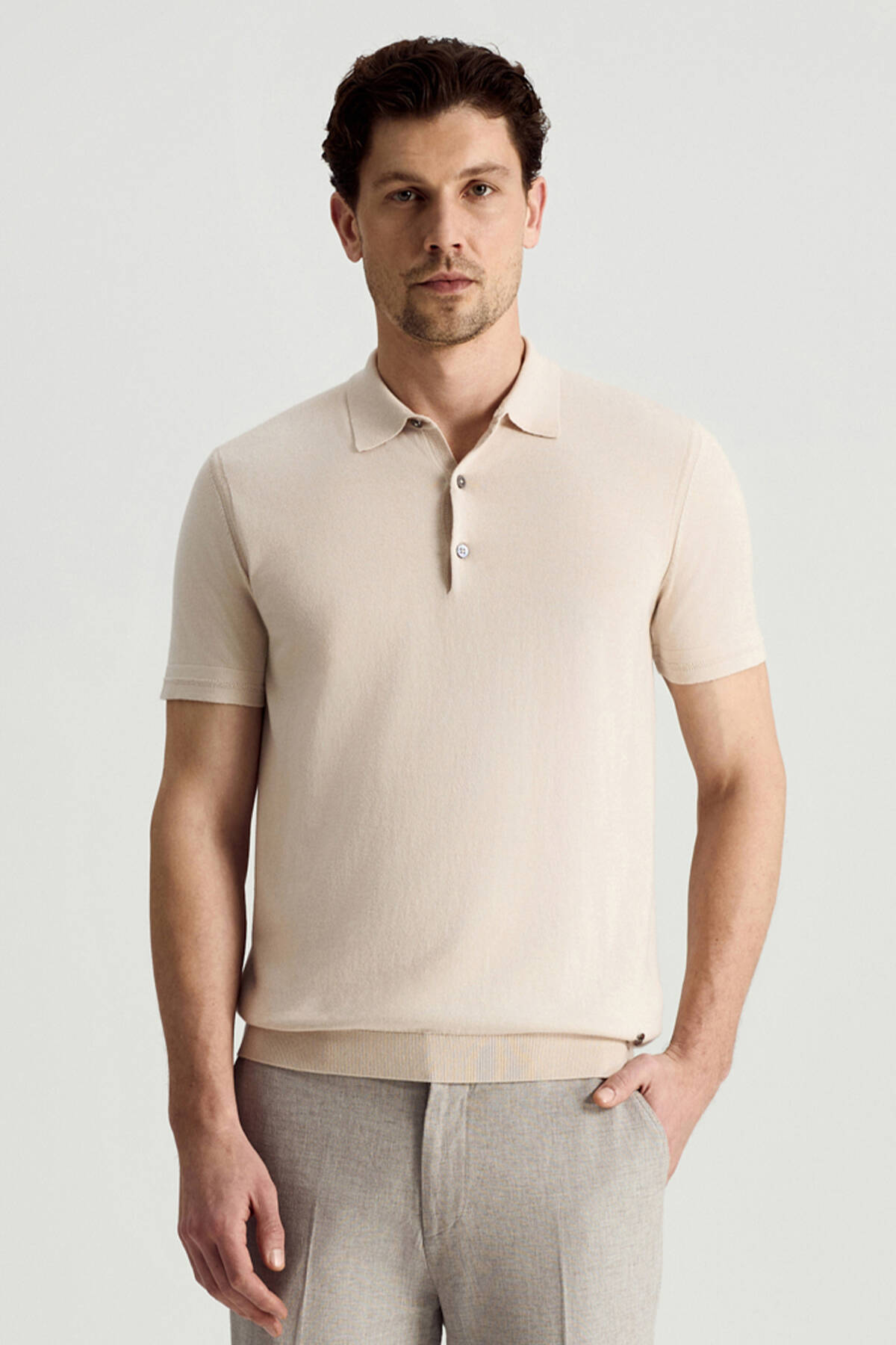 Doğallığını kaşmir karışımlı pamuk içeriğinden alan krem triko polo yaka üst, birinci sınıf kalitede giyim deneyimi vadeder. İlk temastan itibaren triko dokusuna hayran kalacağınız triko polo; zamansız krem rengi, uzun ömürlü dayanıklı yapısı ve mükemmel kalıbı ile kendisi için en iyisini isteyen erkekler için vazgeçilmez bir kombin tamamlayıcısıdır.