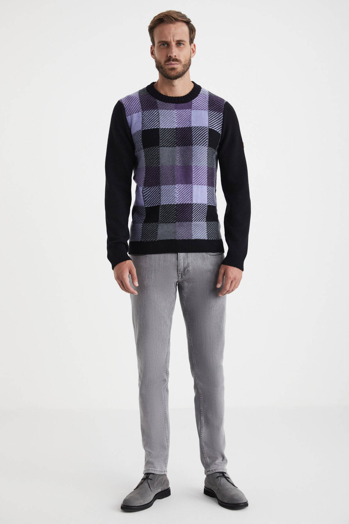 Kaşmir Yün Karışım Tartan Desen Siyah Mor Kazak
