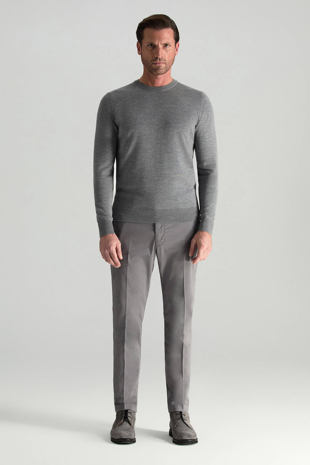 İtalyan merino yün ipliğinin doğal yumuşaklığıyla hazırlanan Bisiklet Yaka Gri Triko Kazak, konforu ve stil bütünlüğünü aynı çizgide buluşturur. İnce dokusu sayesinde ceket altına rahatça giyilebilir; hafta sonu kombinlerinde spor ayakkabı ve denimlerle modern bir görünüm yaratır. Soğuk havalarda tek başına yeterli sıcaklık sunarken, katmanlı kombinlerde de ağırlık yapmaz. Zamansız tasarımı sayesinde sezonlar boyunca gardırobun güvenilir parçalarından biri olmaya adaydır.