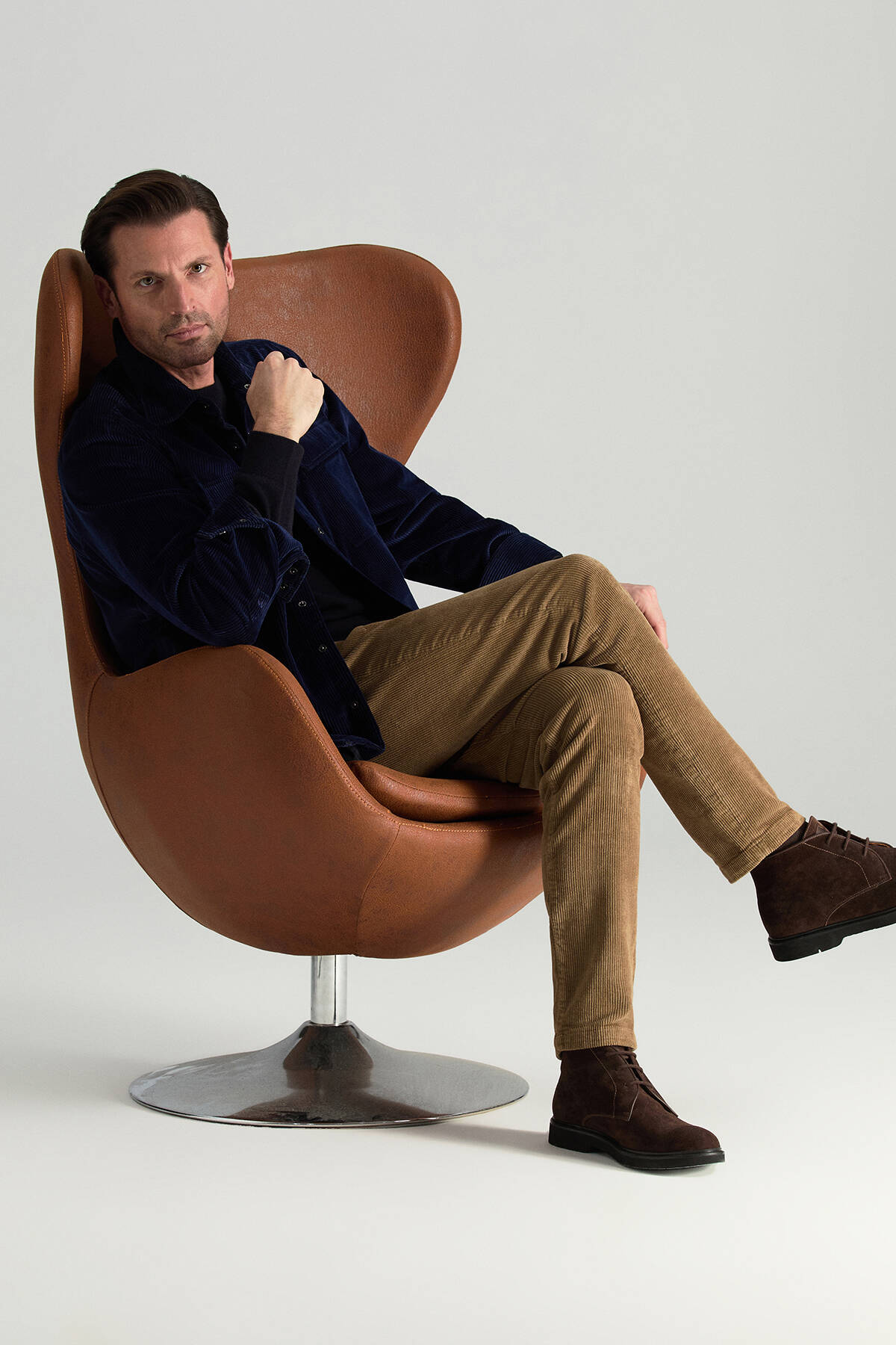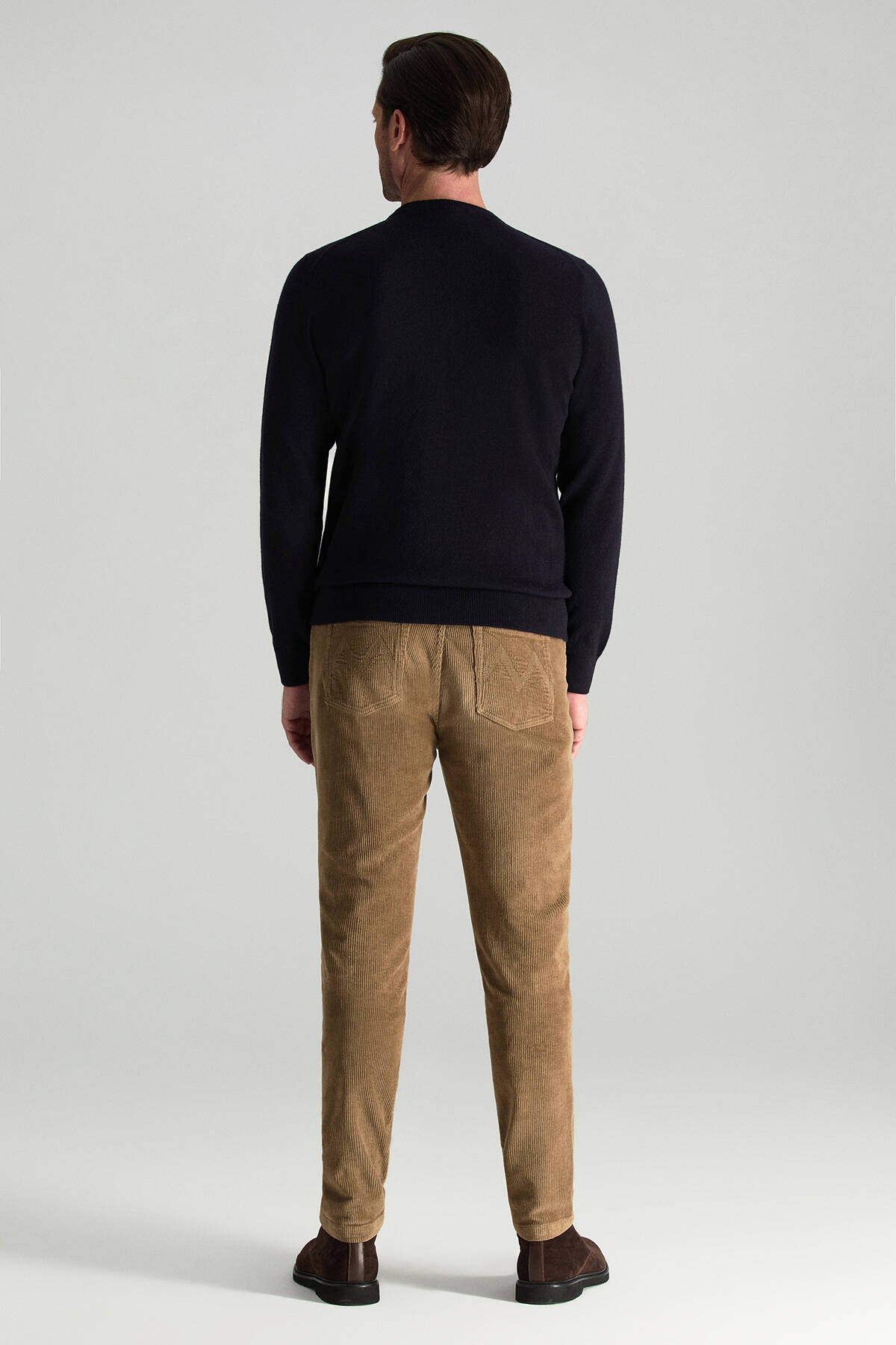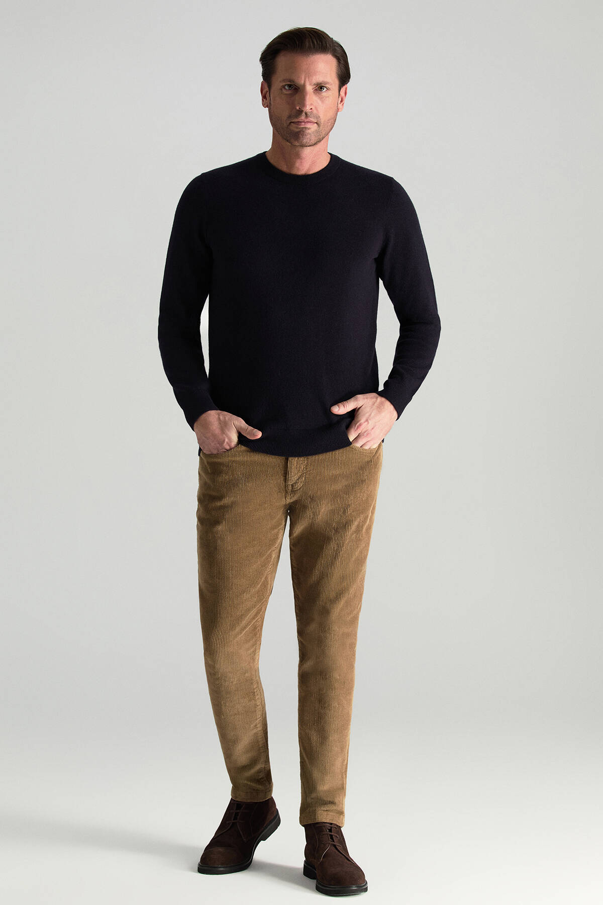 İtalyan merino yününden üretilen bu lacivert bisiklet yaka triko kazak, gardıropta güvenilir bir temel parça olarak öne çıkar, hem spor hem de daha özenli kombinlerin merkezine yerleşir. Denimlerle kombinlendiğinde hafta sonu stiline modern bir dokunuş katarken, klasik pantolonlarla tamamlandığında daha rafine bir çizgi yakalar. İnce ve pürüzsüz yüzeyi sayesinde ceket veya palto altına rahatlıkla giyilebilir; katmanlı kombinlerde ağırlık yapmadan sıcaklık sağlar.