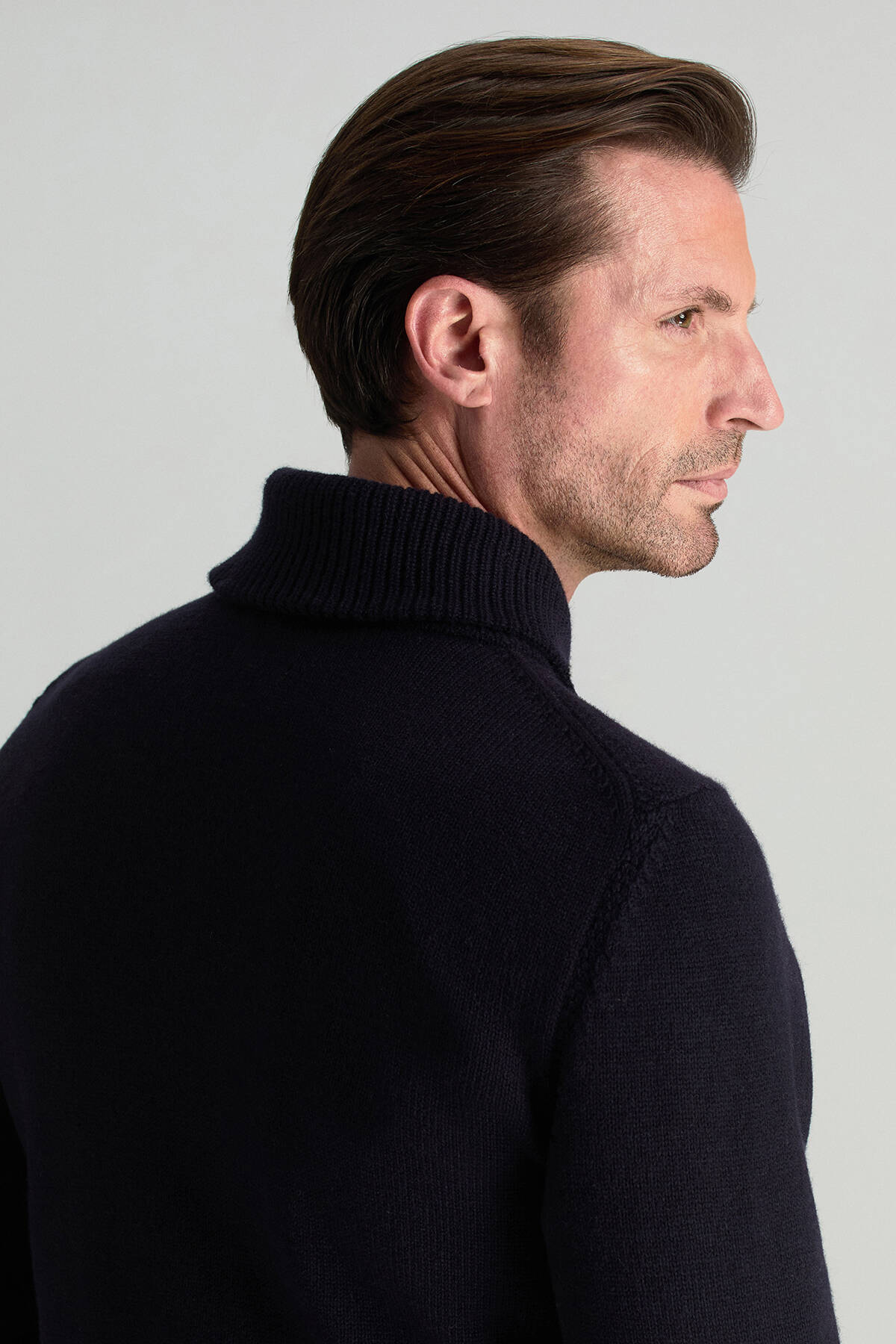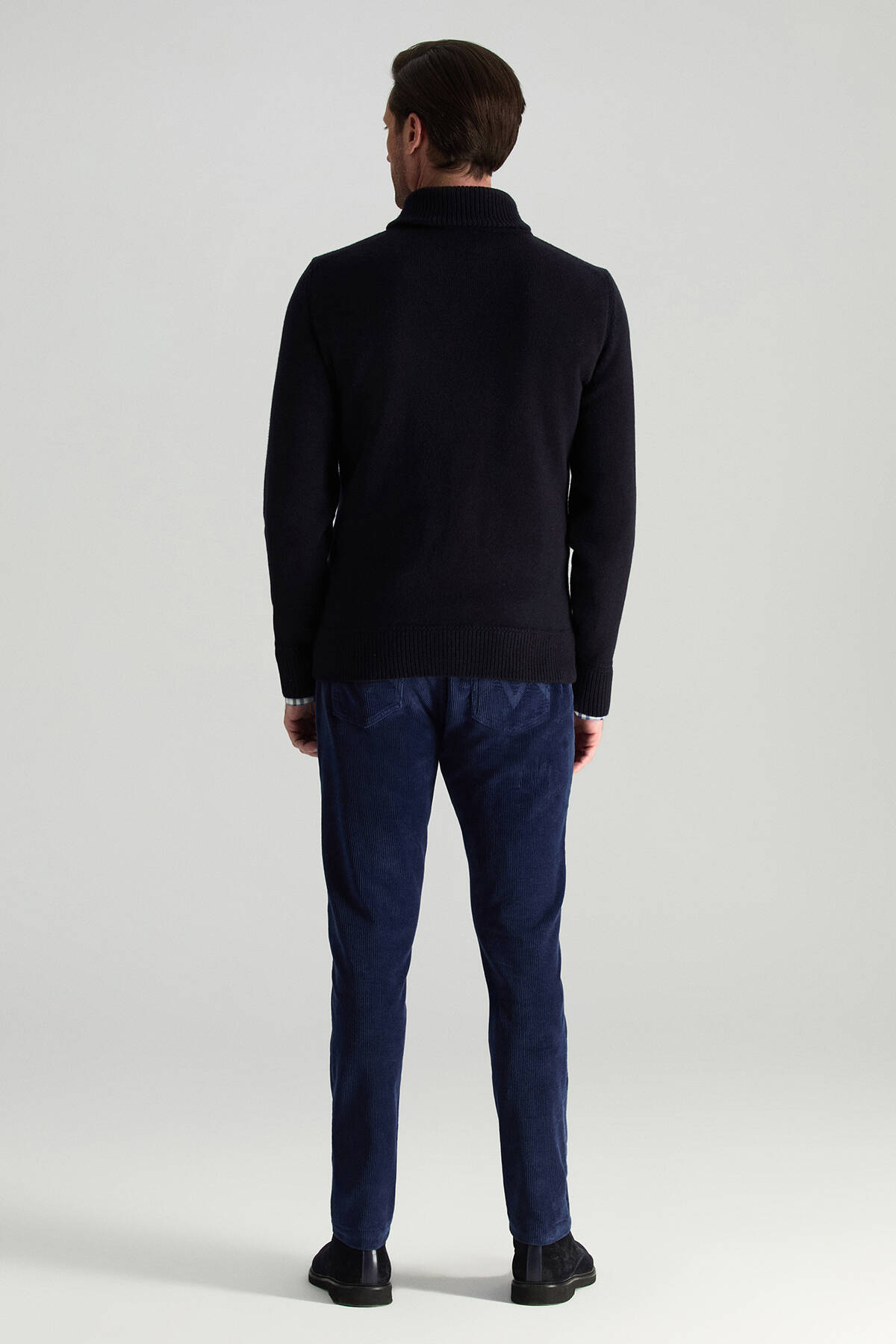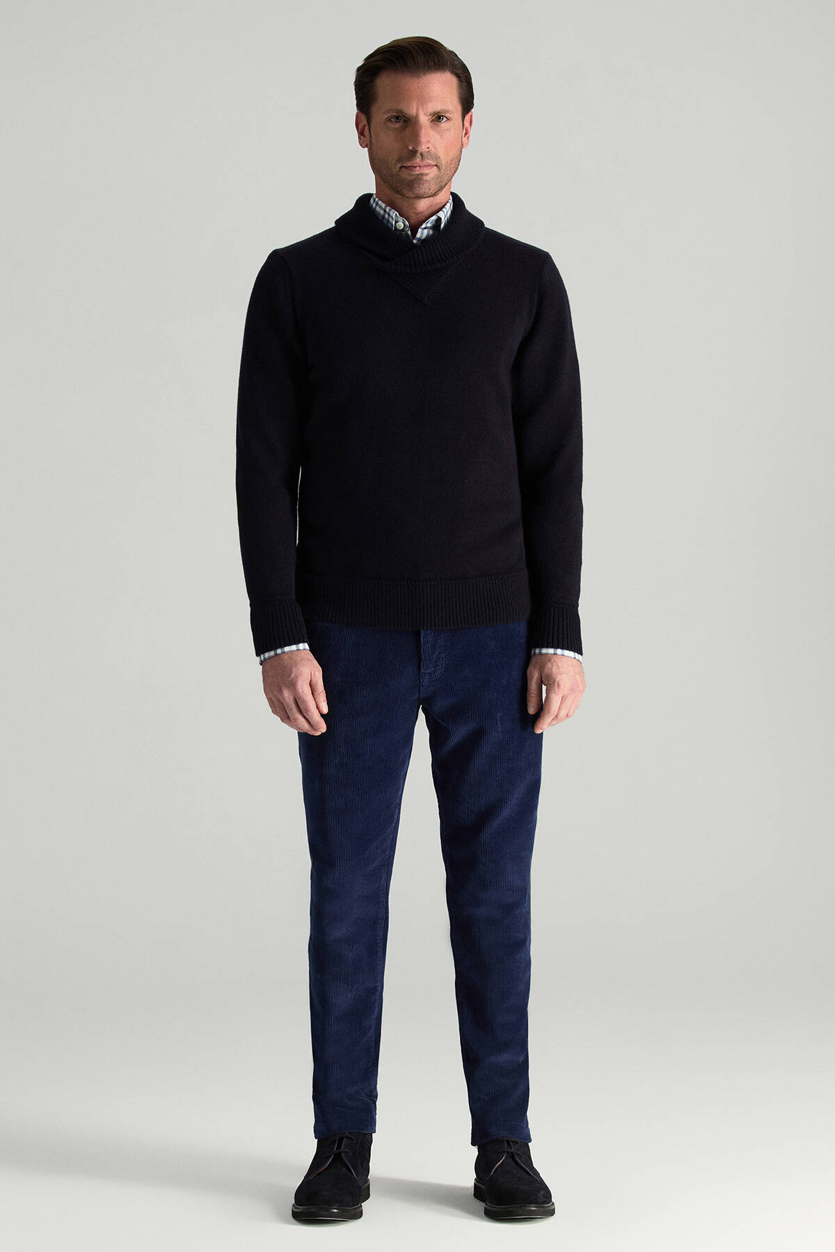 Modern çizgilerle yorumlanan bu lacivert triko kazak, güçlü duruşunu şal yaka formundan alır. İtalyan merino yün ipliğinin doğal yapısı sayesinde nefes alabilen ince yüzeye sahip olan tasarım, hafifliği ve yumuşak dokusuyla konforu ön plana çıkarır, rahat ama özenli bir görünüm oluşturur. Lacivert rengi, her stile kolayca uyum sağlayarak gardırobun vazgeçilmez parçalarından biri haline gelir.
