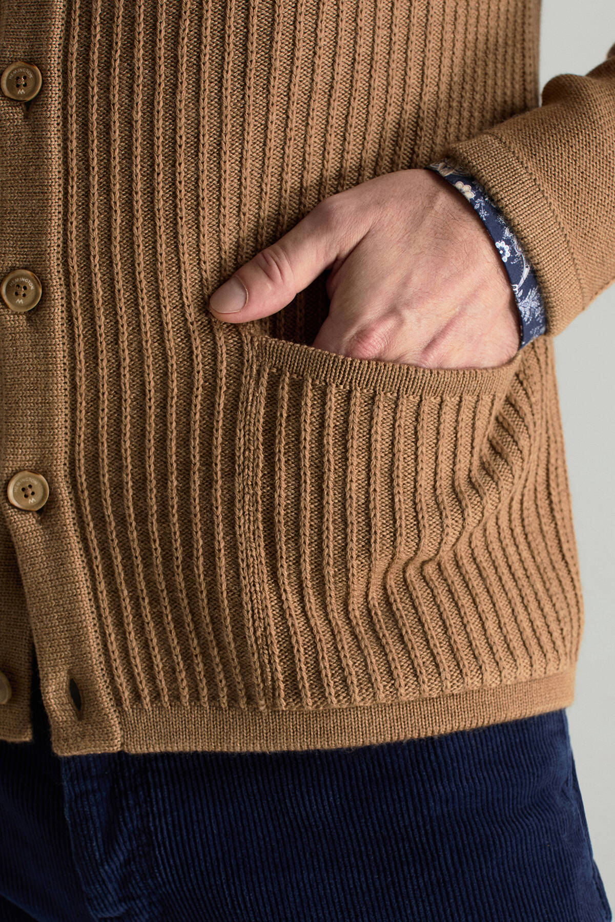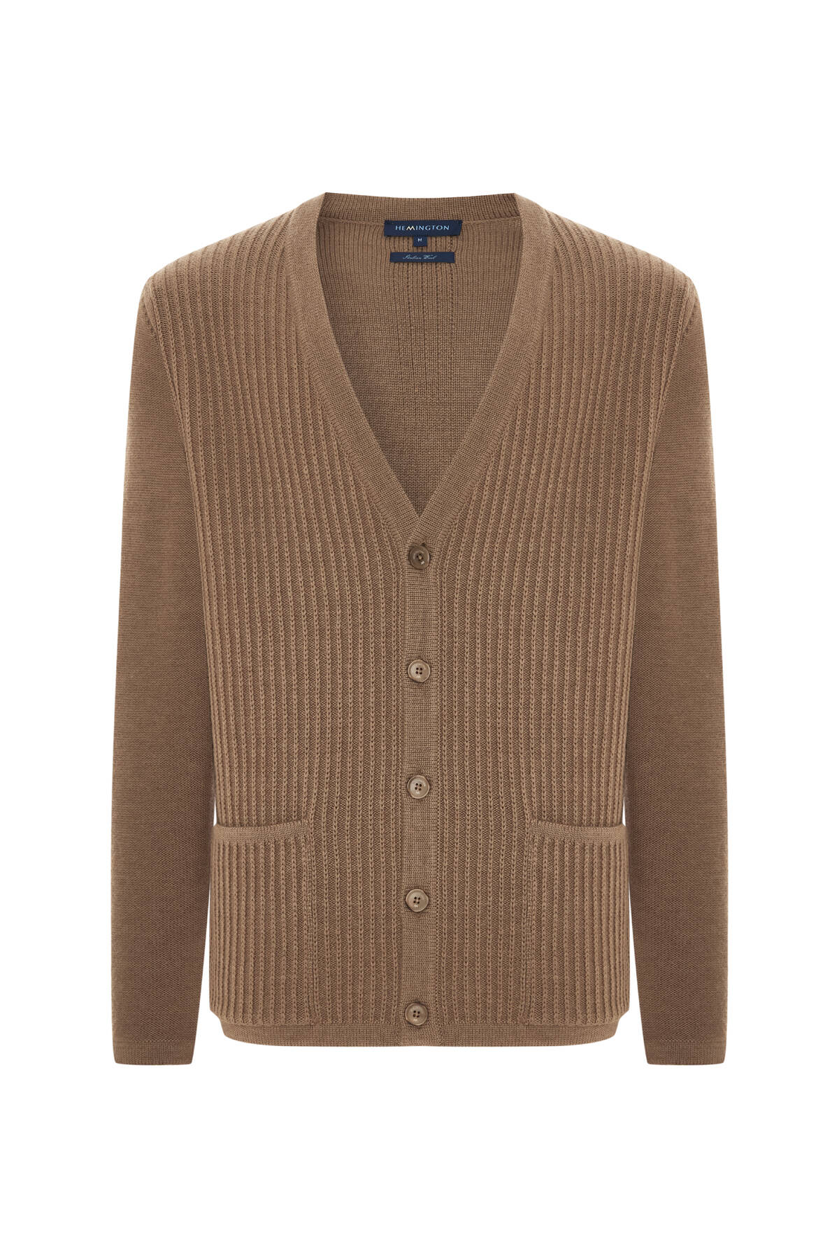 Merino Yünü Şerit Desenli Camel Triko Hırka