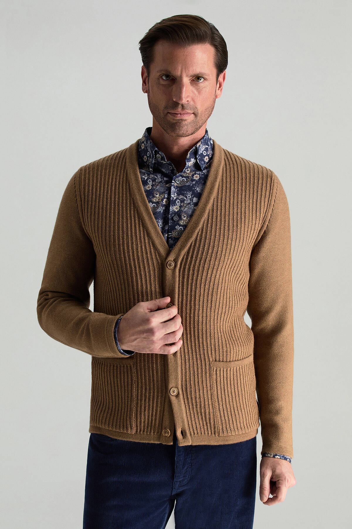 Camel renginin huzurlu ve sıcak etkisini şerit desenlerle buluşturan bu merino yün hırka, hem gündelik hem de daha özenli kombinlerde rahatlıkla kullanılabilir. Doğal kemik düğmeleri, tasarıma sofistike bir karakter kazandırır. Gömlek üzerine giyildiğinde klasik bir görünüm elde edilirken, ince bir tişörtle kombinlendiğinde daha rahat ve modern bir stil yakalanabilir. Yumuşak merino dokusu, serin havalarda sıcaklık sunarken nefes alabilen yapısıyla gün boyu konfor sağlar.