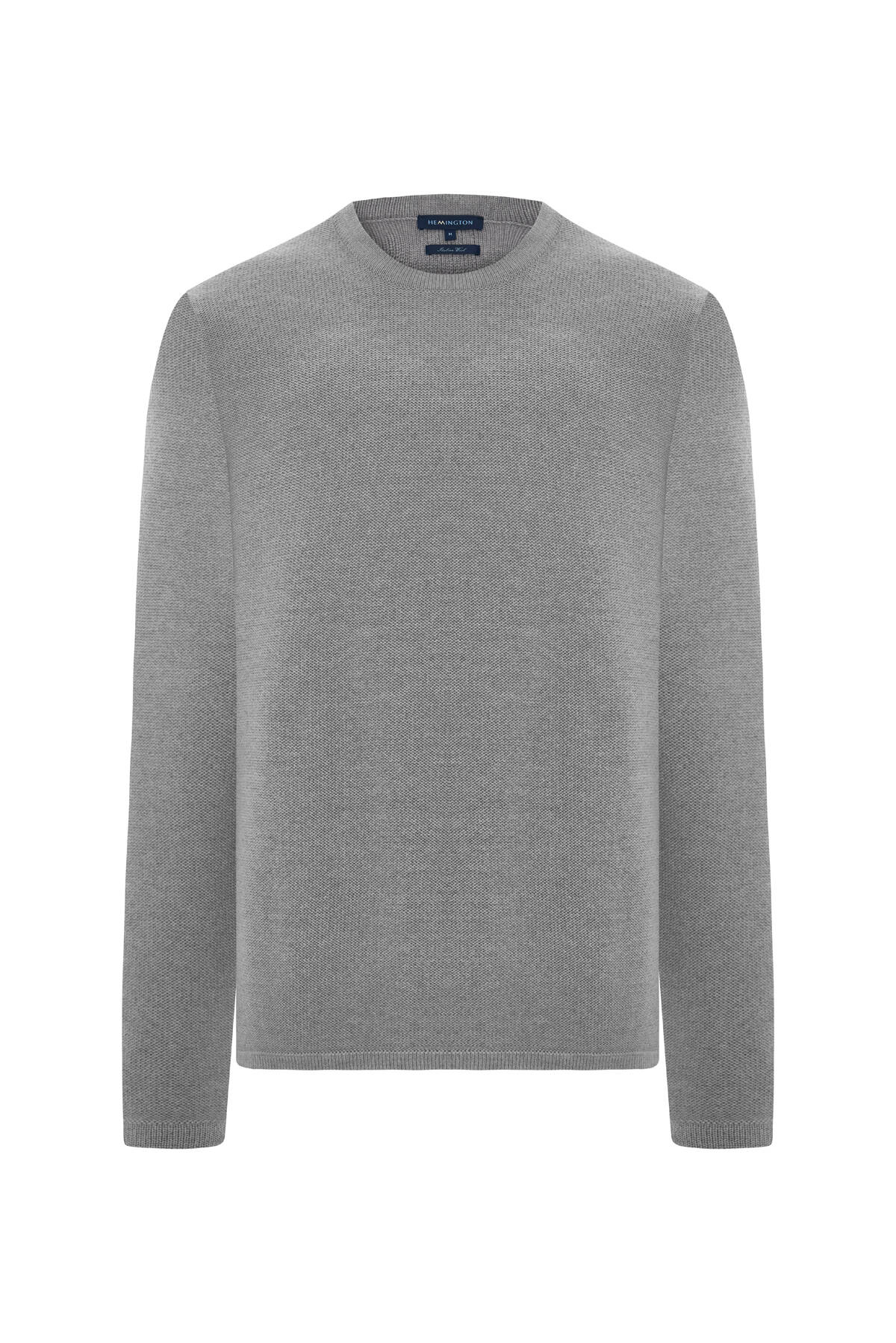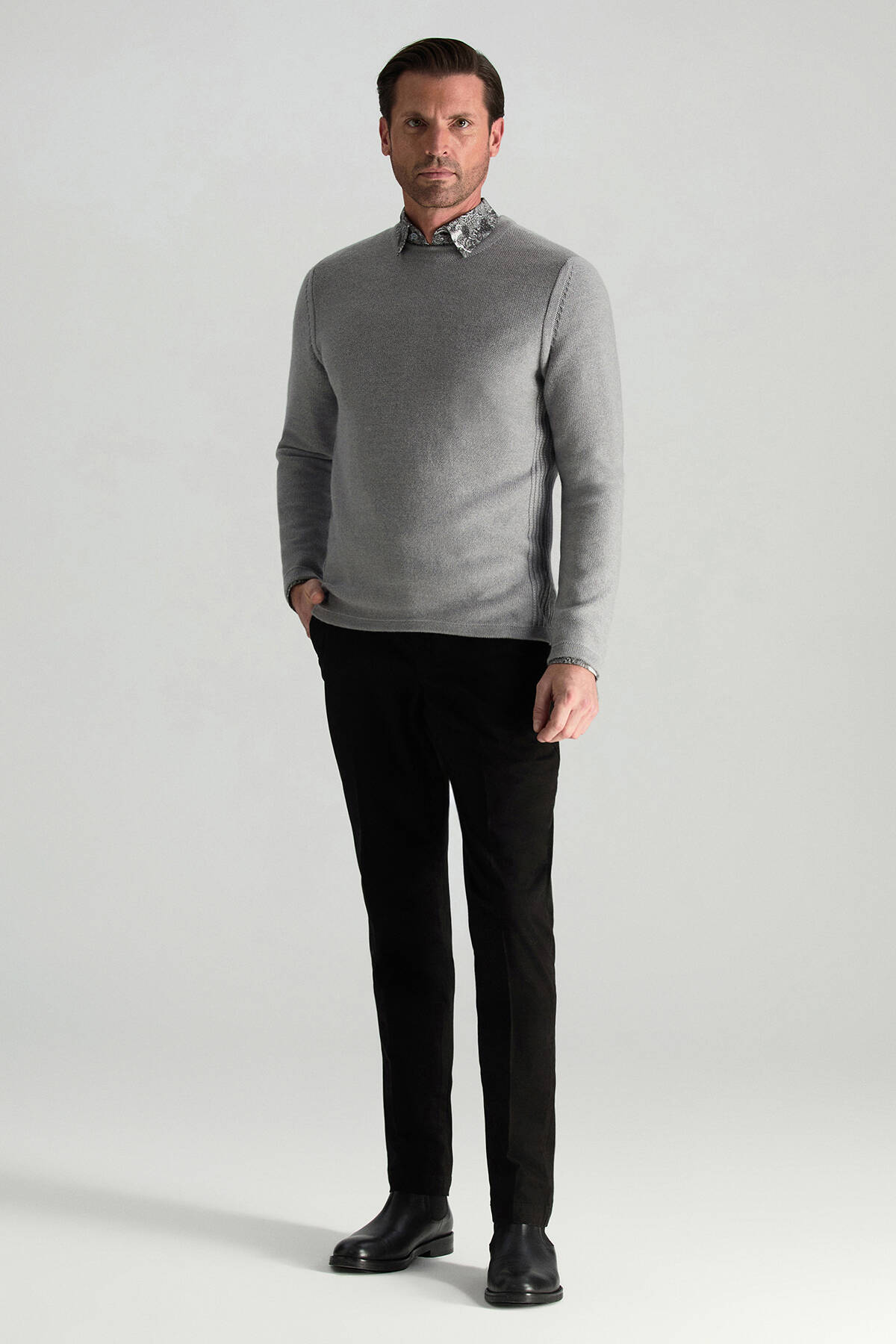 Merino Yünü Şerit Detaylı Bisiklet Yaka Açık Gri Triko Kazak