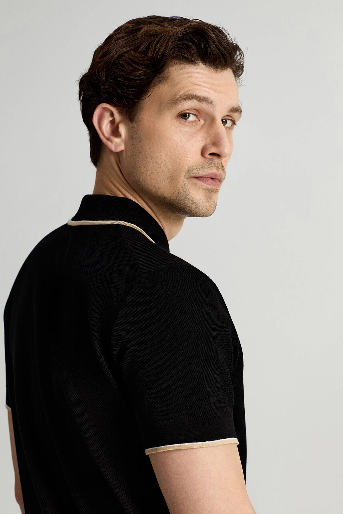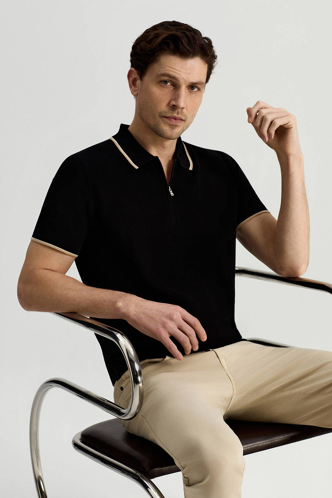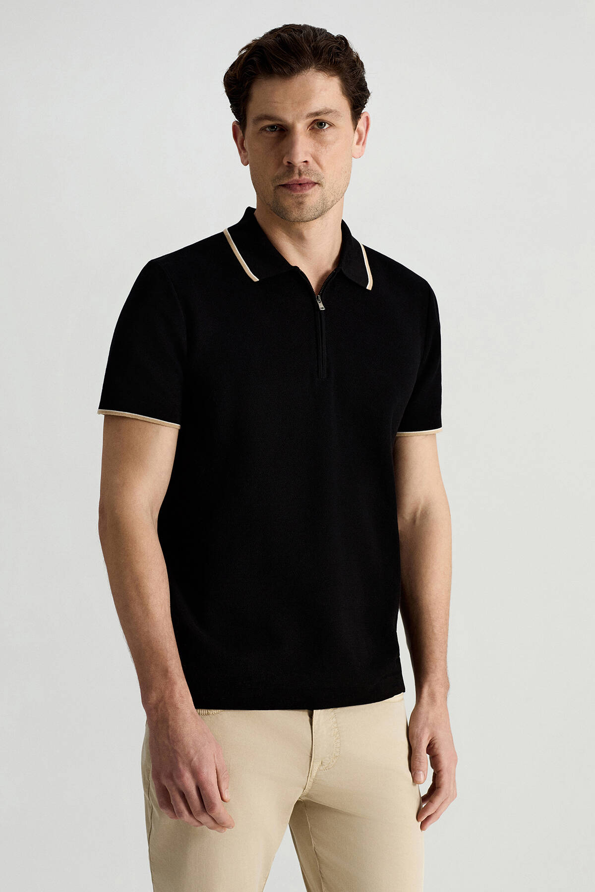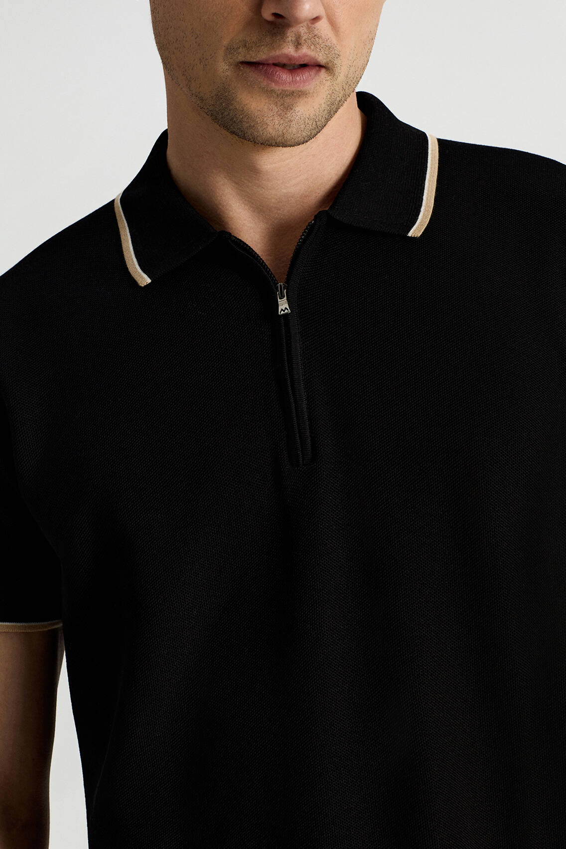 Merserize Pamuk Fermuar Yaka Siyah Triko Polo