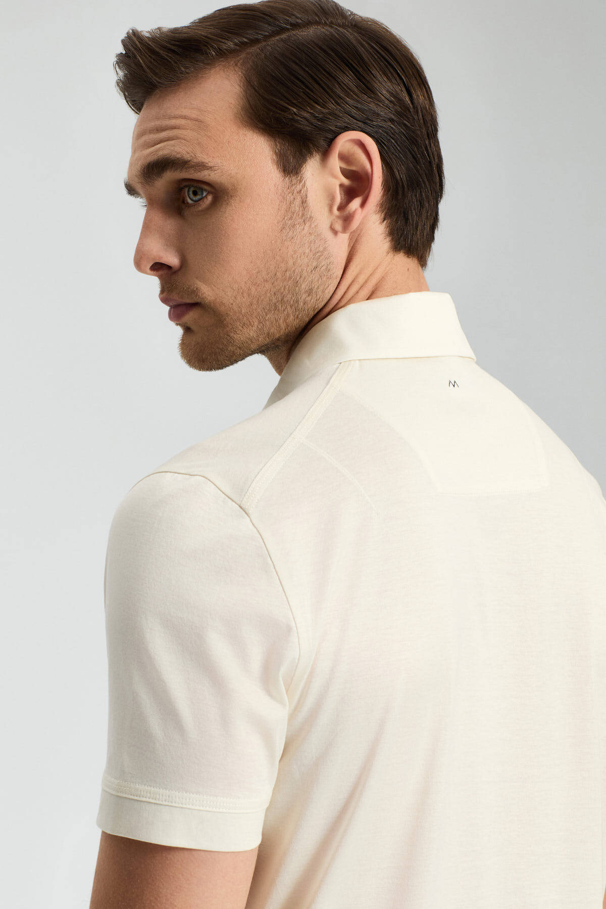 Krem rengiyle klasik şıklığı yansıtan merserize pamuk polo yaka T-shirt, rahatlığı ve zarafeti bir arada sunar. Günlük kombinlerinize sofistike bir dokunuş ekler.