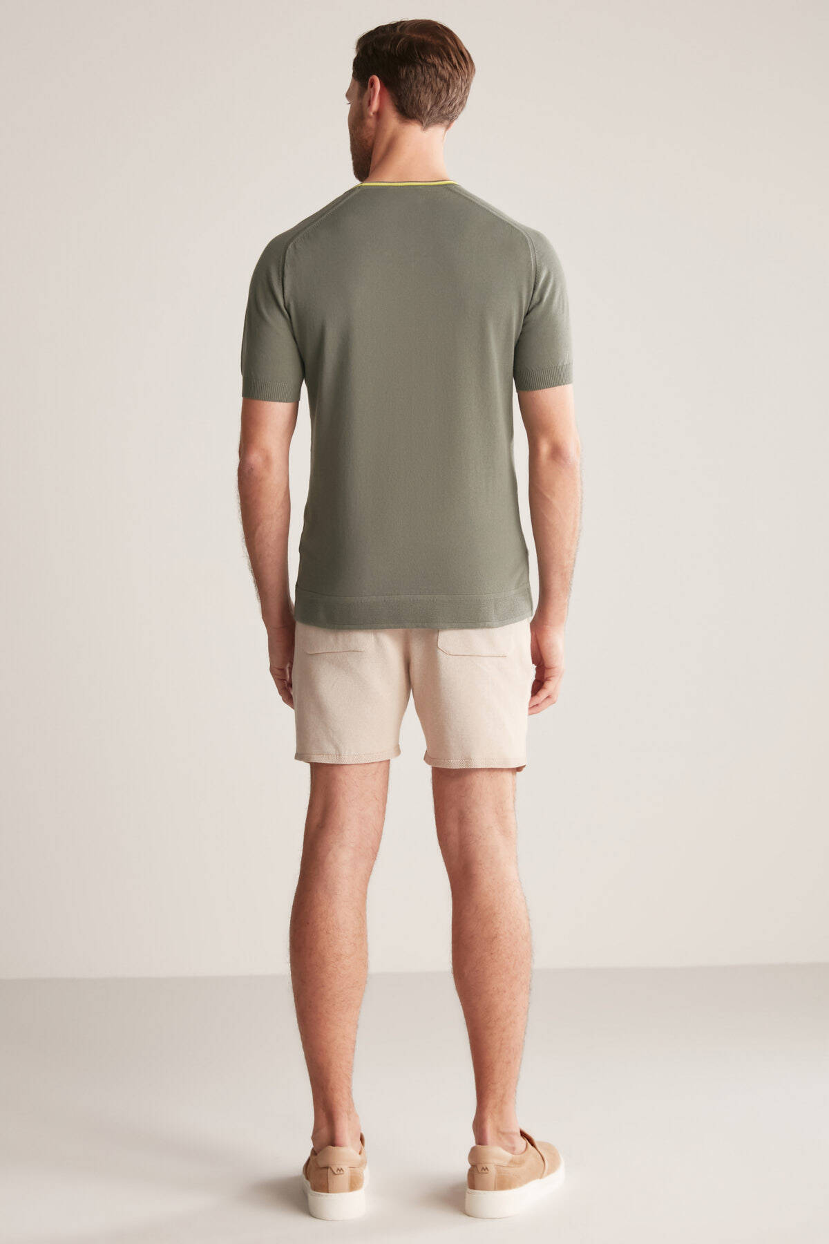 Nakış Logolu Yaka Detaylı Haki Triko T-Shirt - Thumbnail