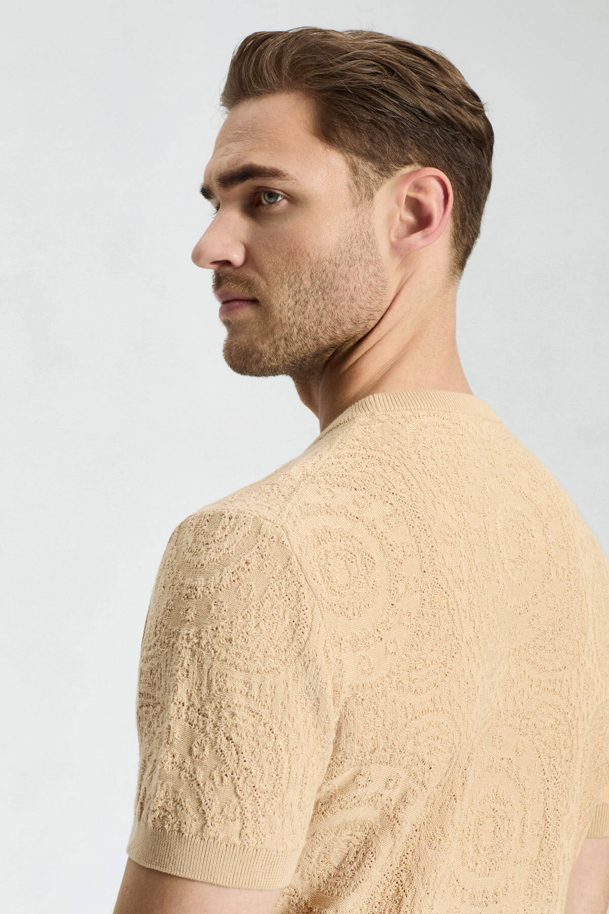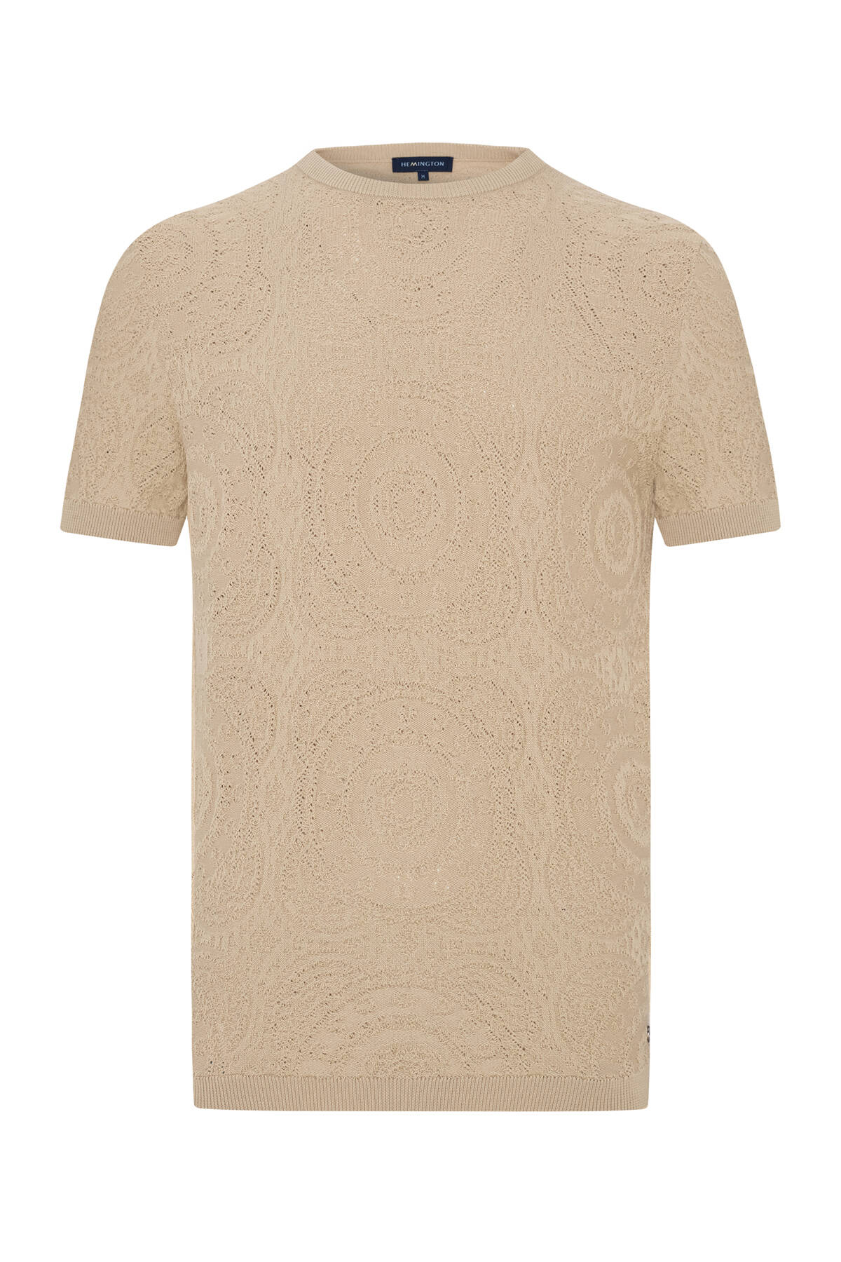 Örgü Desen Krem Rengi Bisiklet Yaka Triko T-Shirt