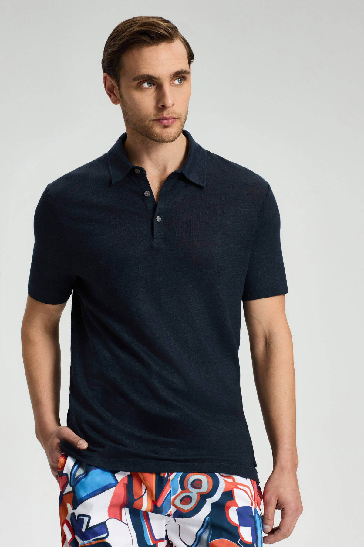 Saf Keten Lacivert Polo Yaka T-Shirt