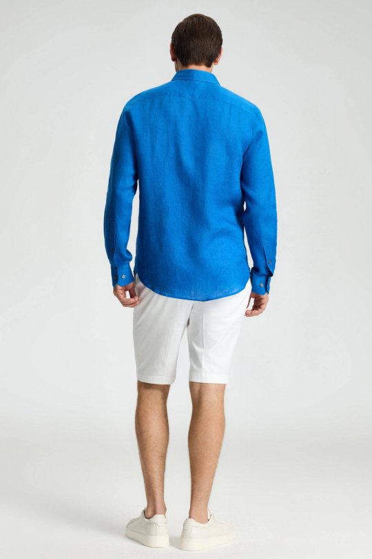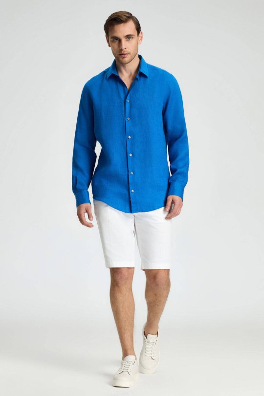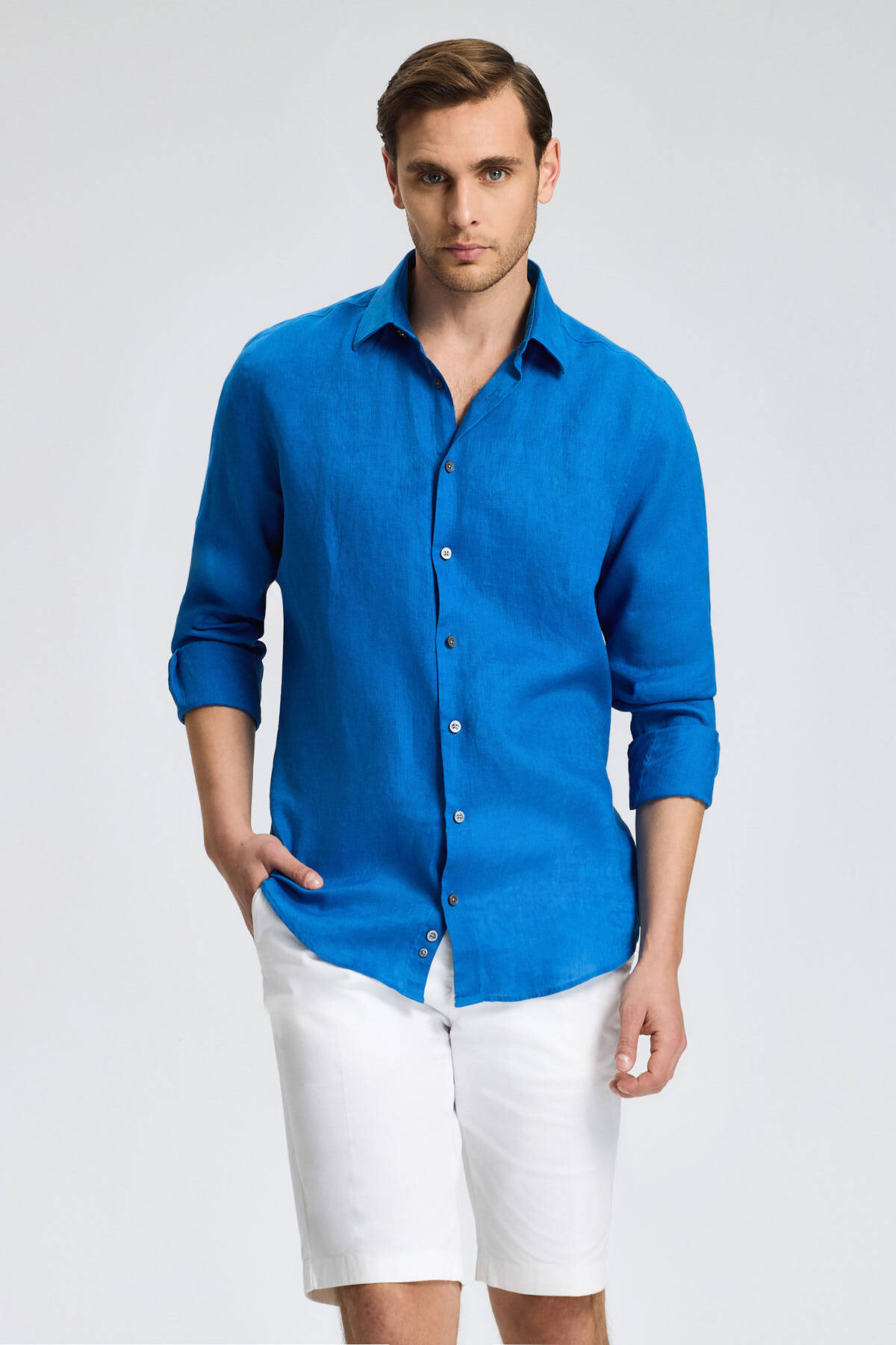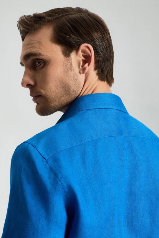 Soğuk tuşesi ve nefes alan ince yüzeyi ile Hemington ayrıcalığını yazlık kombinlerinize taşıyacağınız saf keten erkek gömlek modelini keşfedin. Zamansız indigo rengi ile ön plana çıkan erkek spor gömlek, rahat kalıbı ve sedef düğme detayları ile ne istediğini bilen erkekler için gündüzden geceye şıklık ve konfor sunar.
