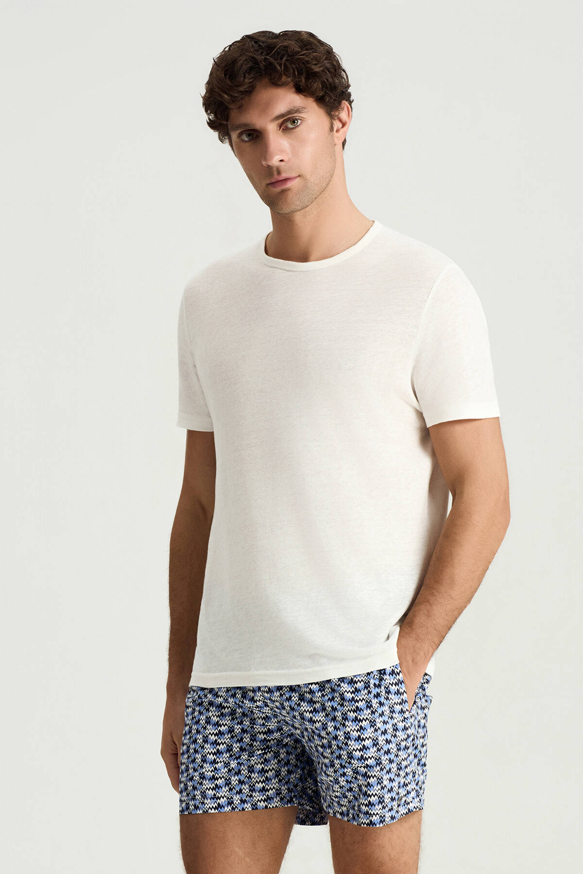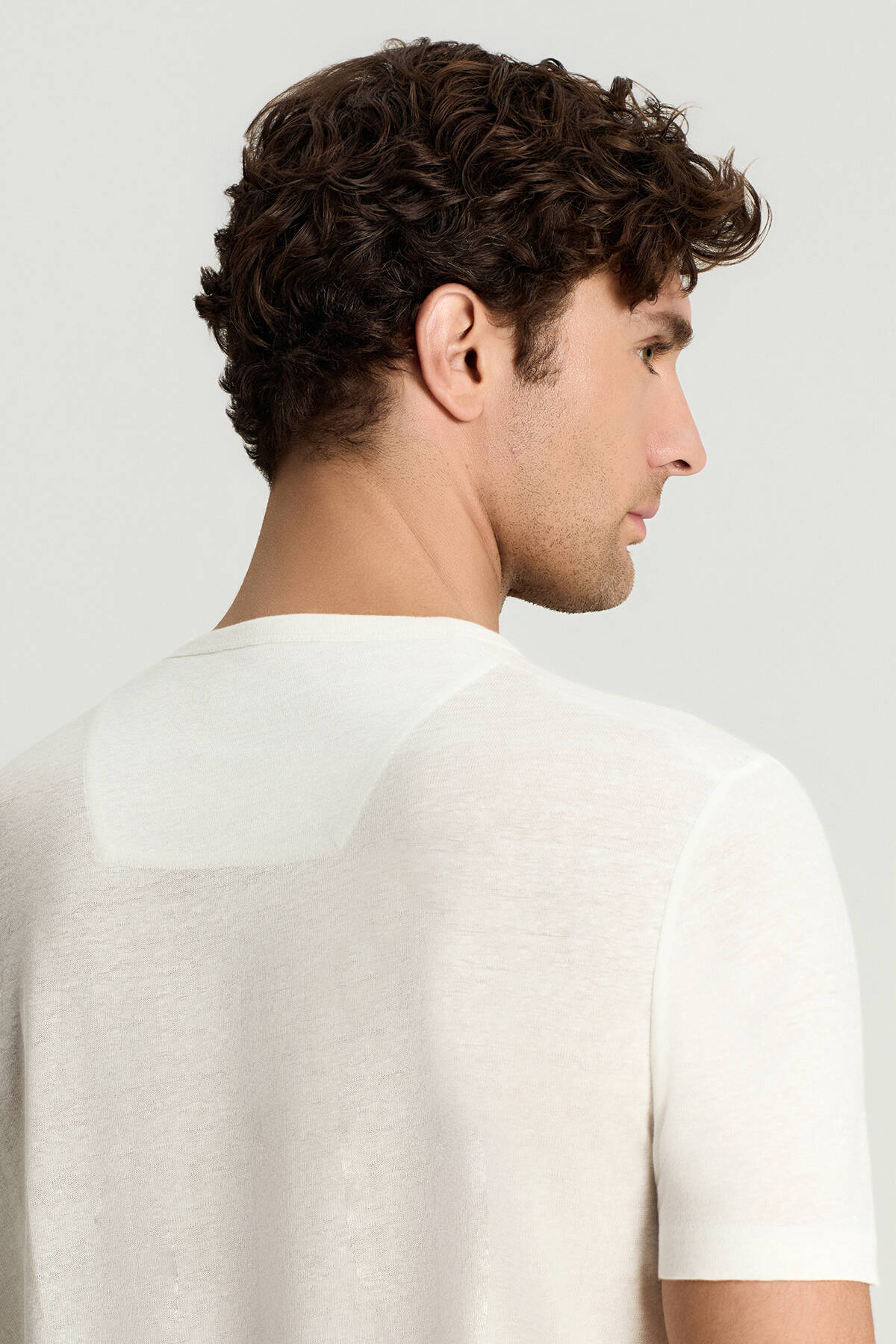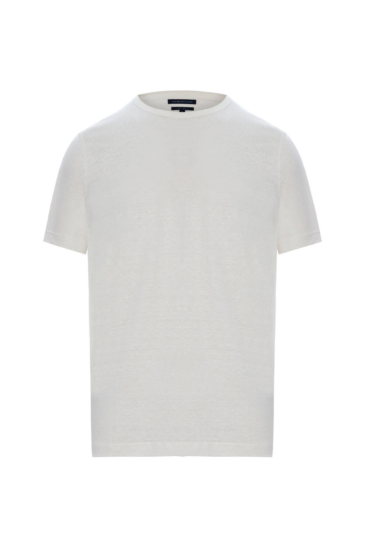 Saf Keten Kırık Beyaz Bisiklet Yaka T-Shirt