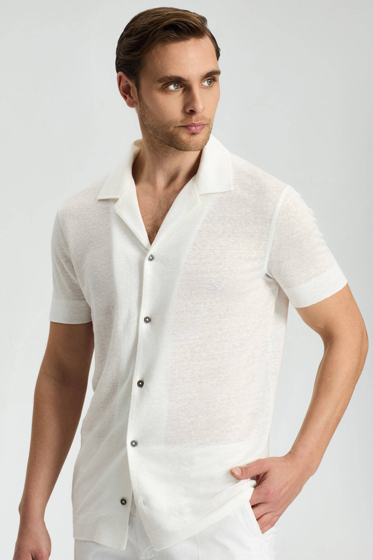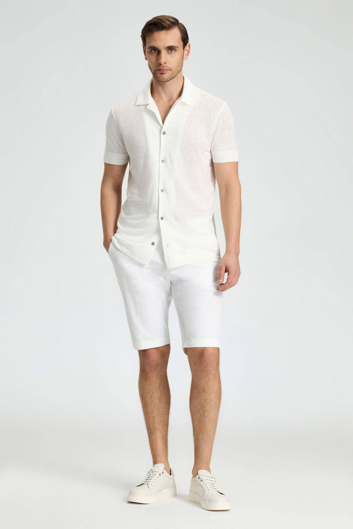 Saf keten kumaşın ferah dokusuyla tasarlanan kısa kollu beyaz gömlek, yaz sıcaklarında serin ve rahat kalmanızı sağlar. Minimalist şıklığı ve nefes alabilir yapısı sayesinde hem iş hem de günlük kullanıma uygun, klasik bir tercih. Rahat kesimi özgür hareket imkanı sunar.