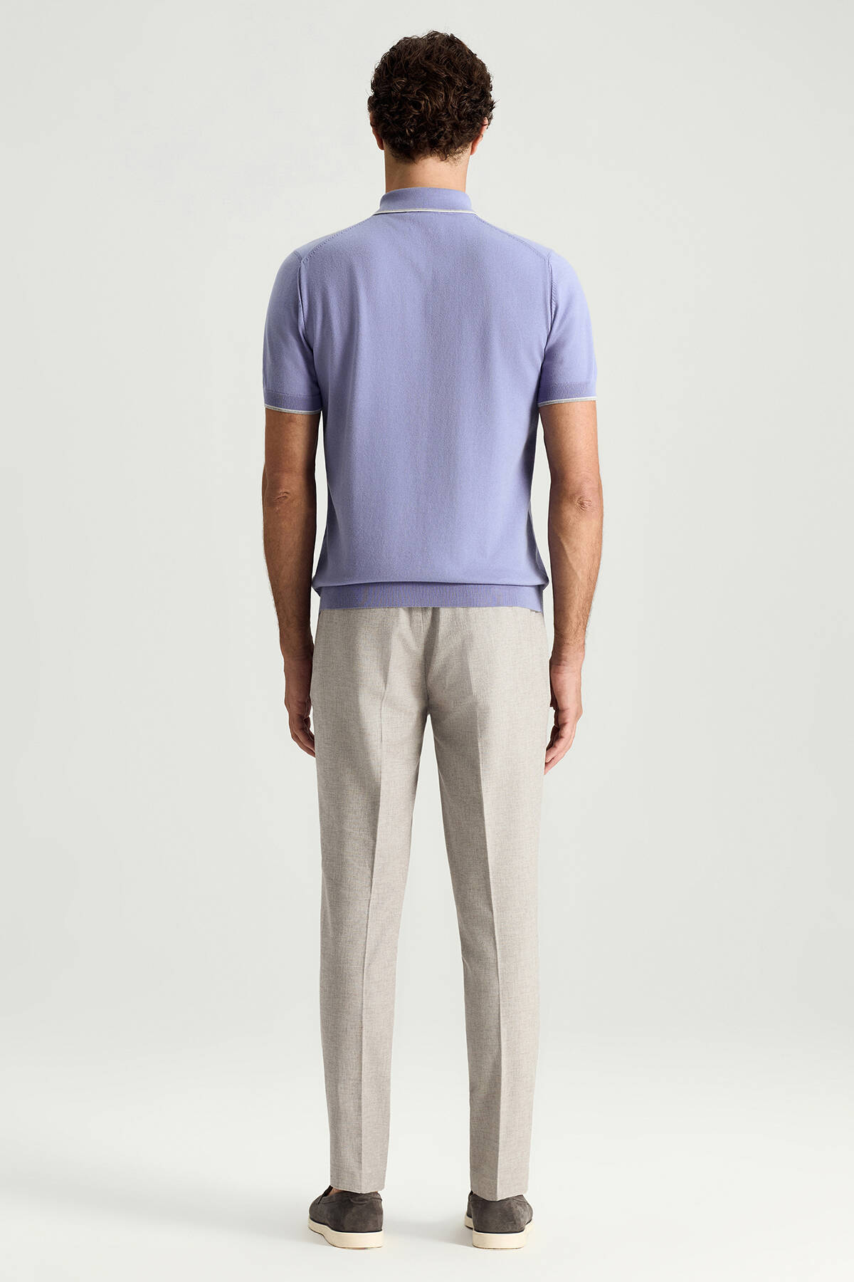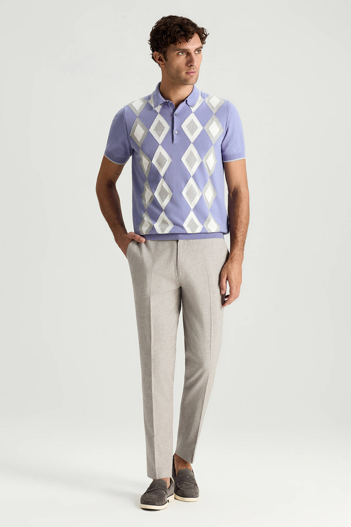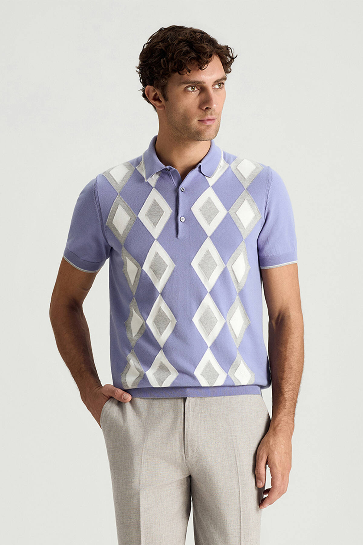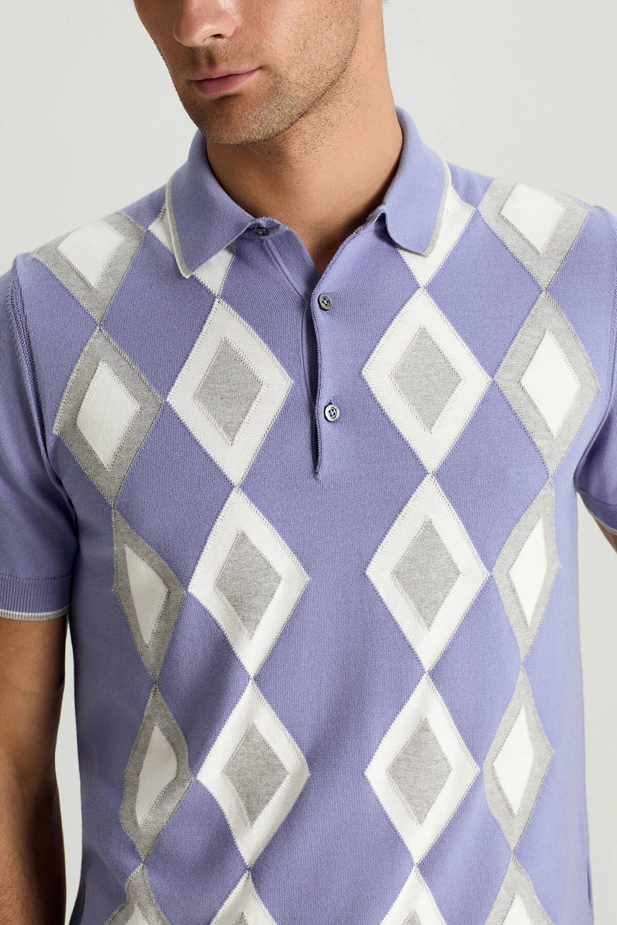 Saf Pamuk Argyle Desen Mor-Açık Gri Triko Polo