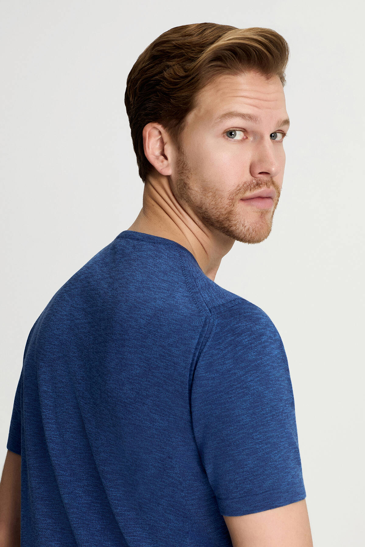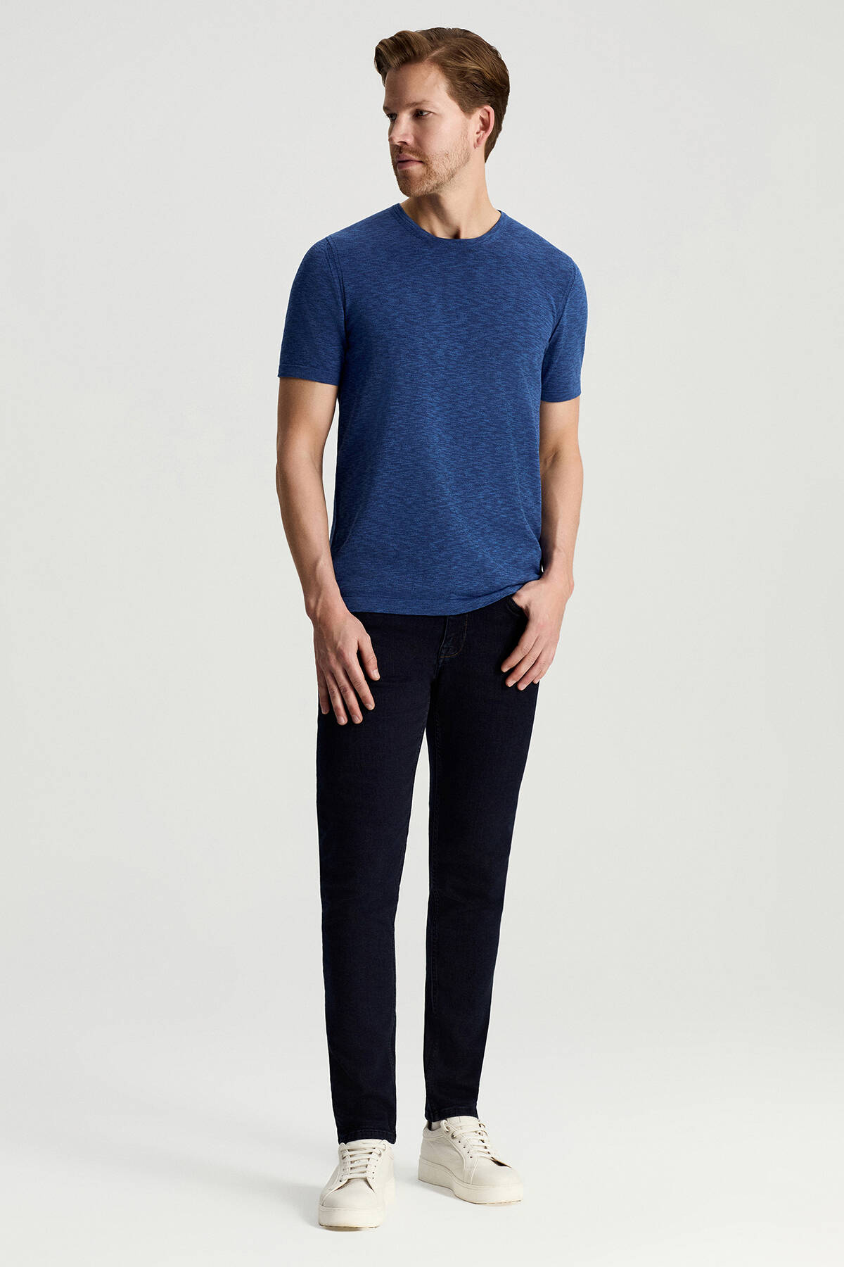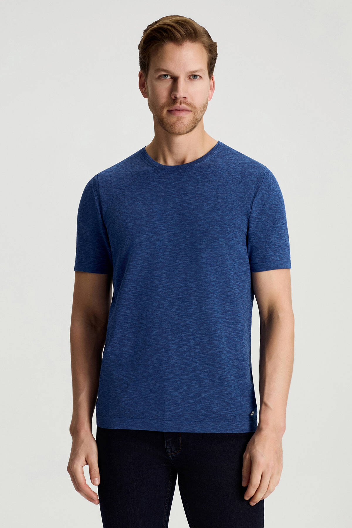 Saf Pamuk Bisiklet Yaka Koyu Mavi Triko T-Shirt