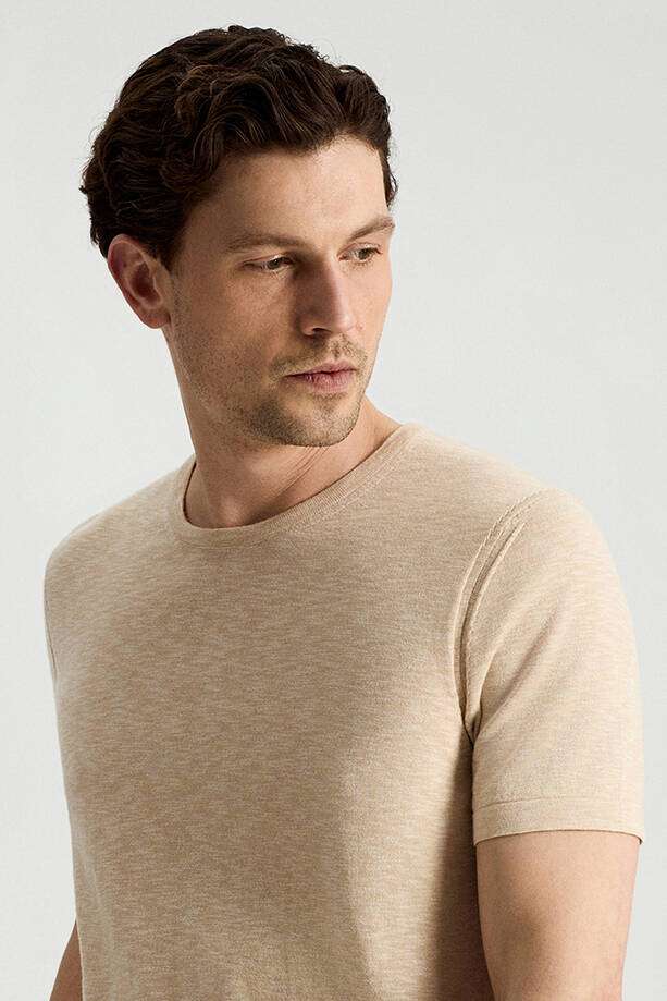 Saf Pamuk Bisiklet Yaka Krem Rengi Triko T-Shirt