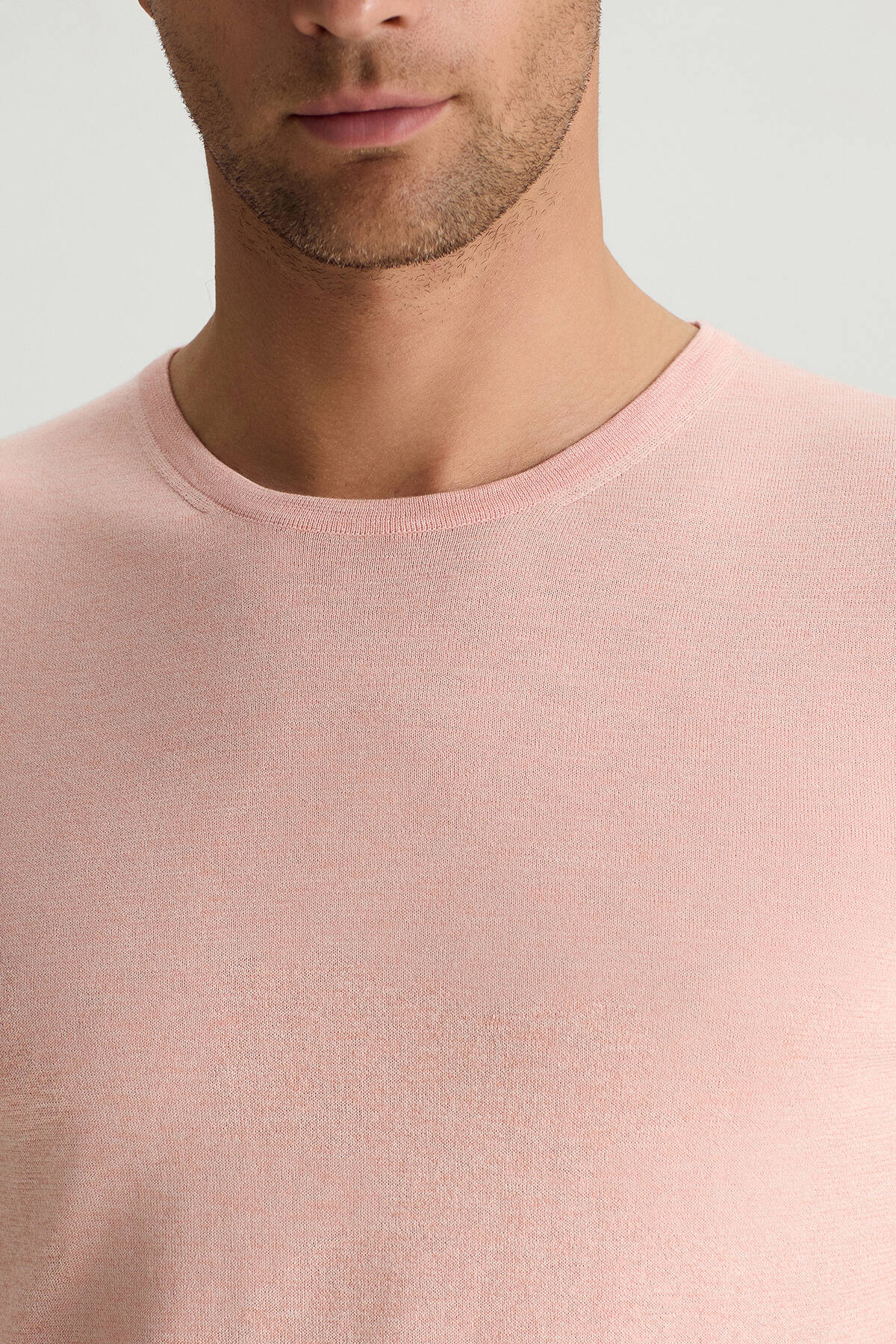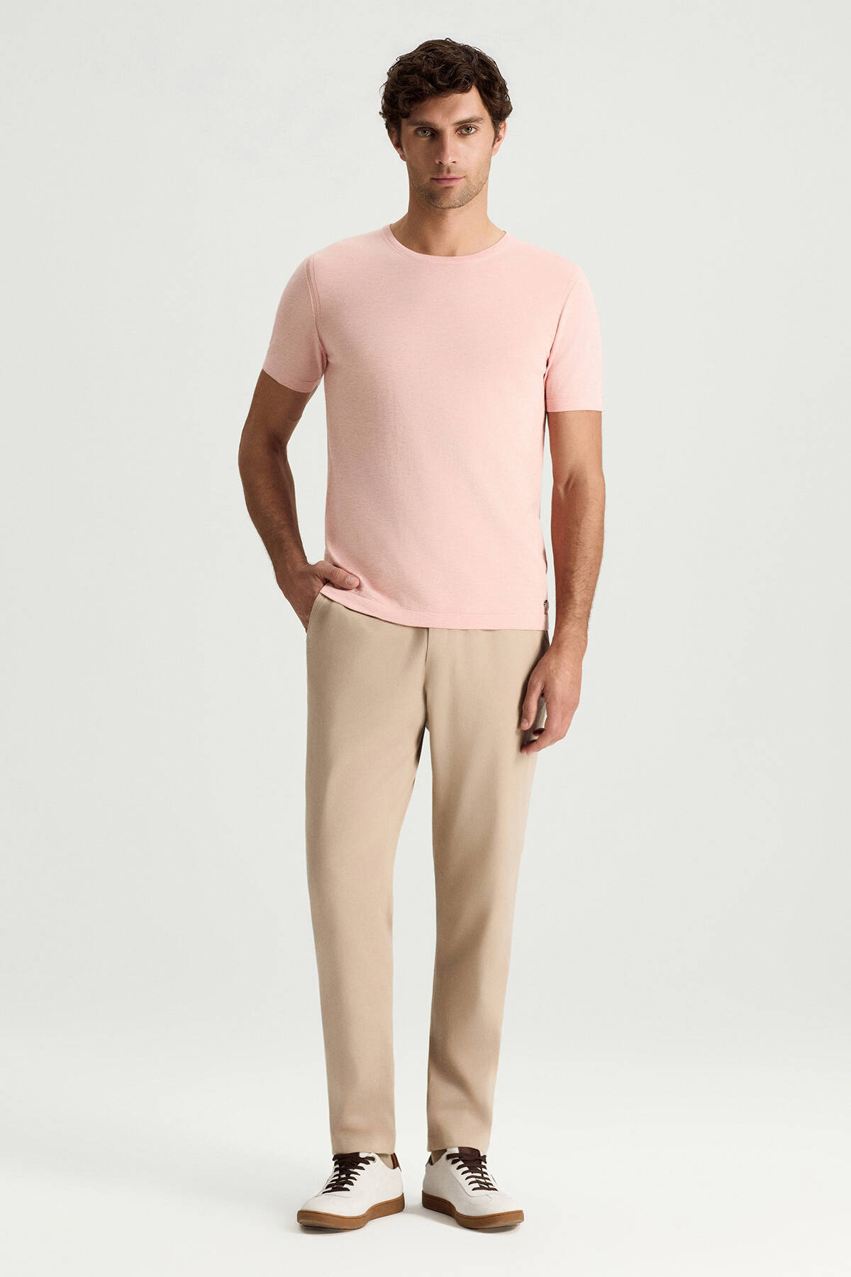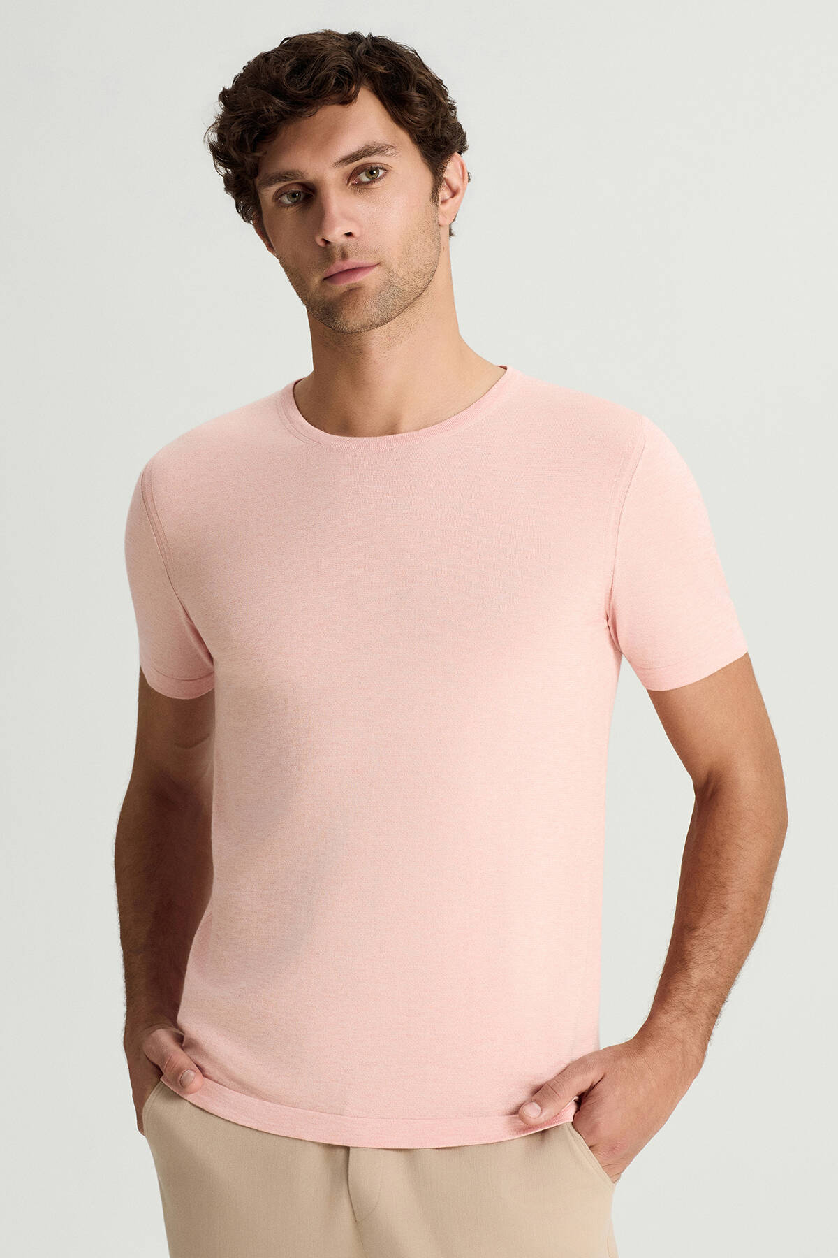 Saf Pamuk Bisiklet Yaka Somon Rengi Triko T-Shirt