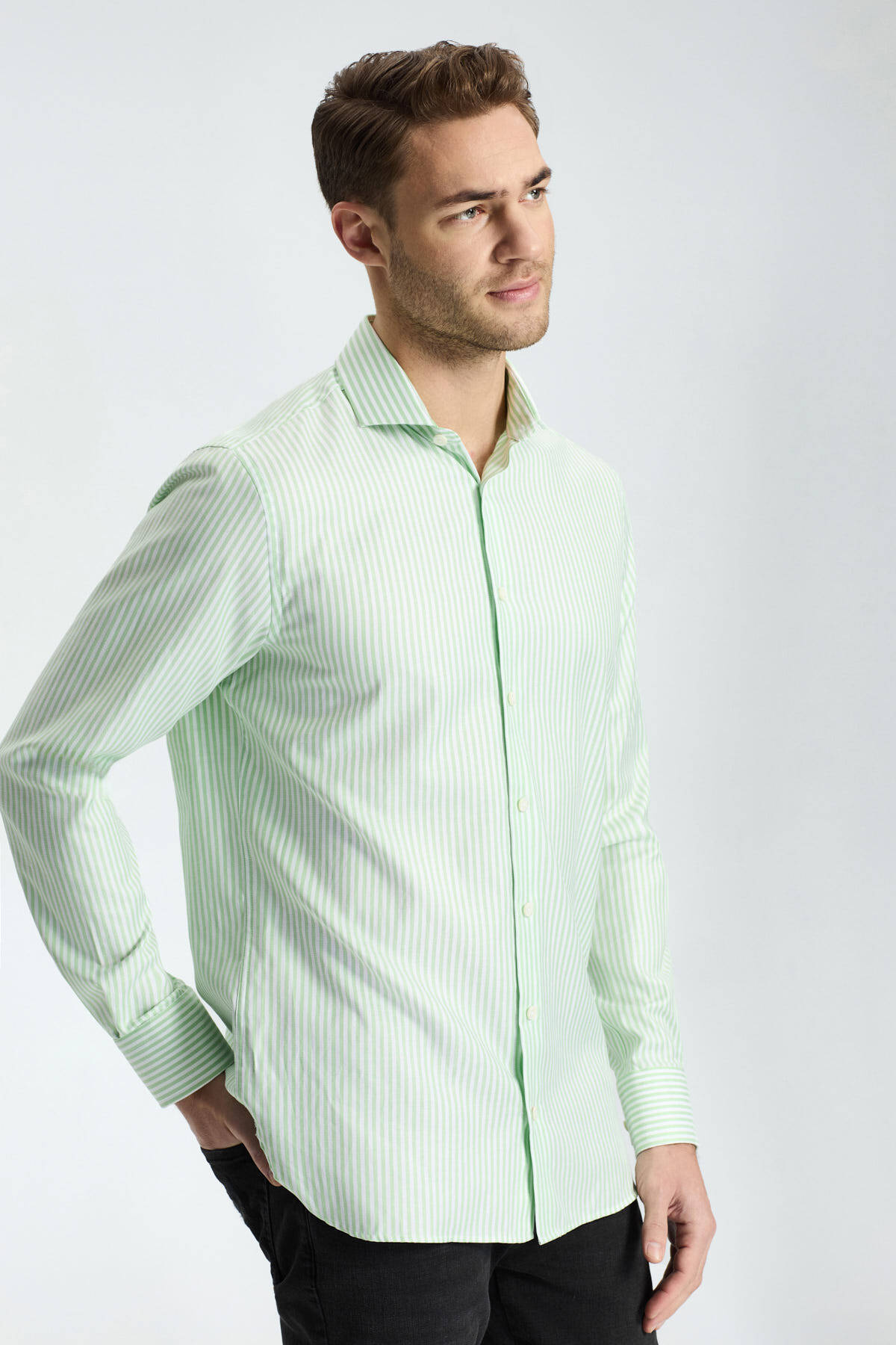 Saf Pamuk Çizgi Desen Açık Yeşil Gömlek
