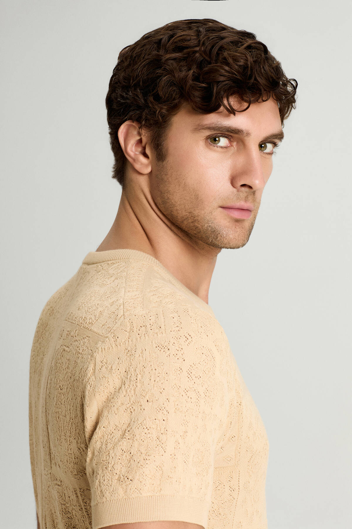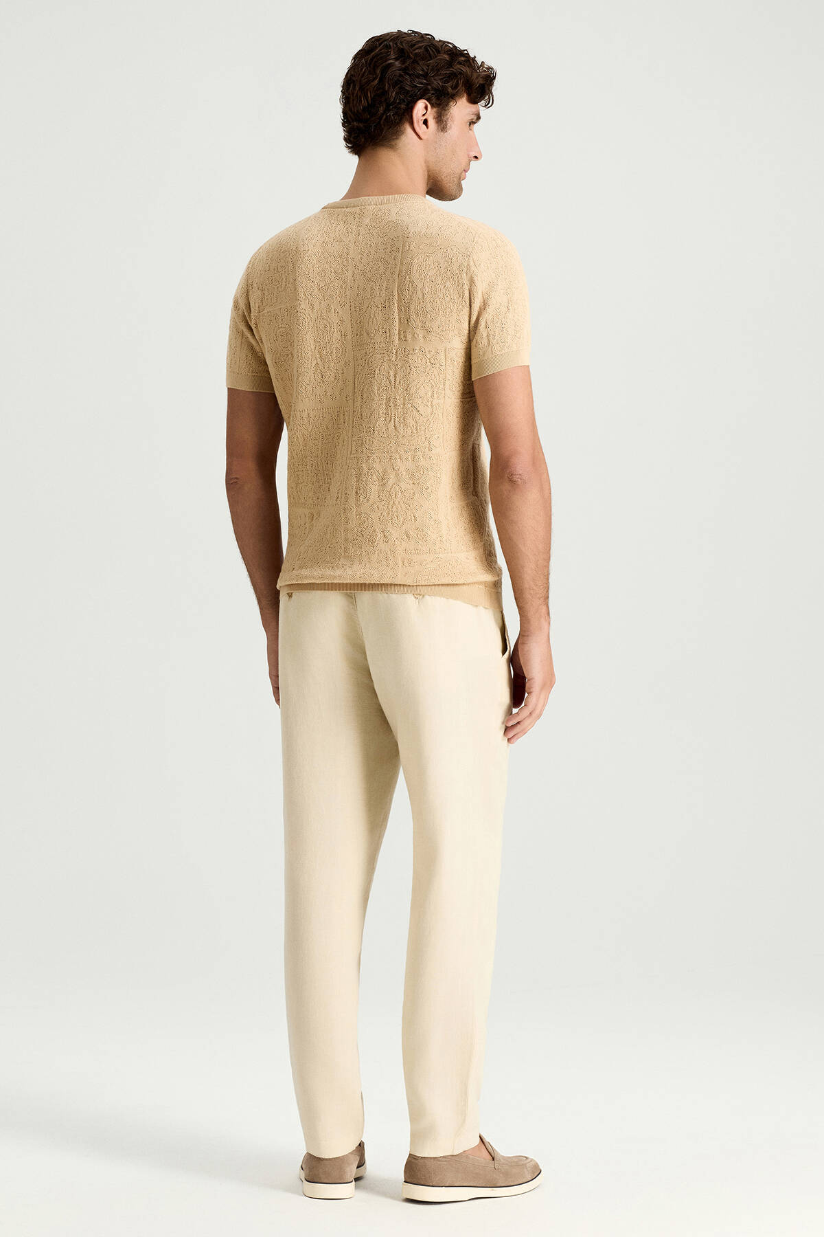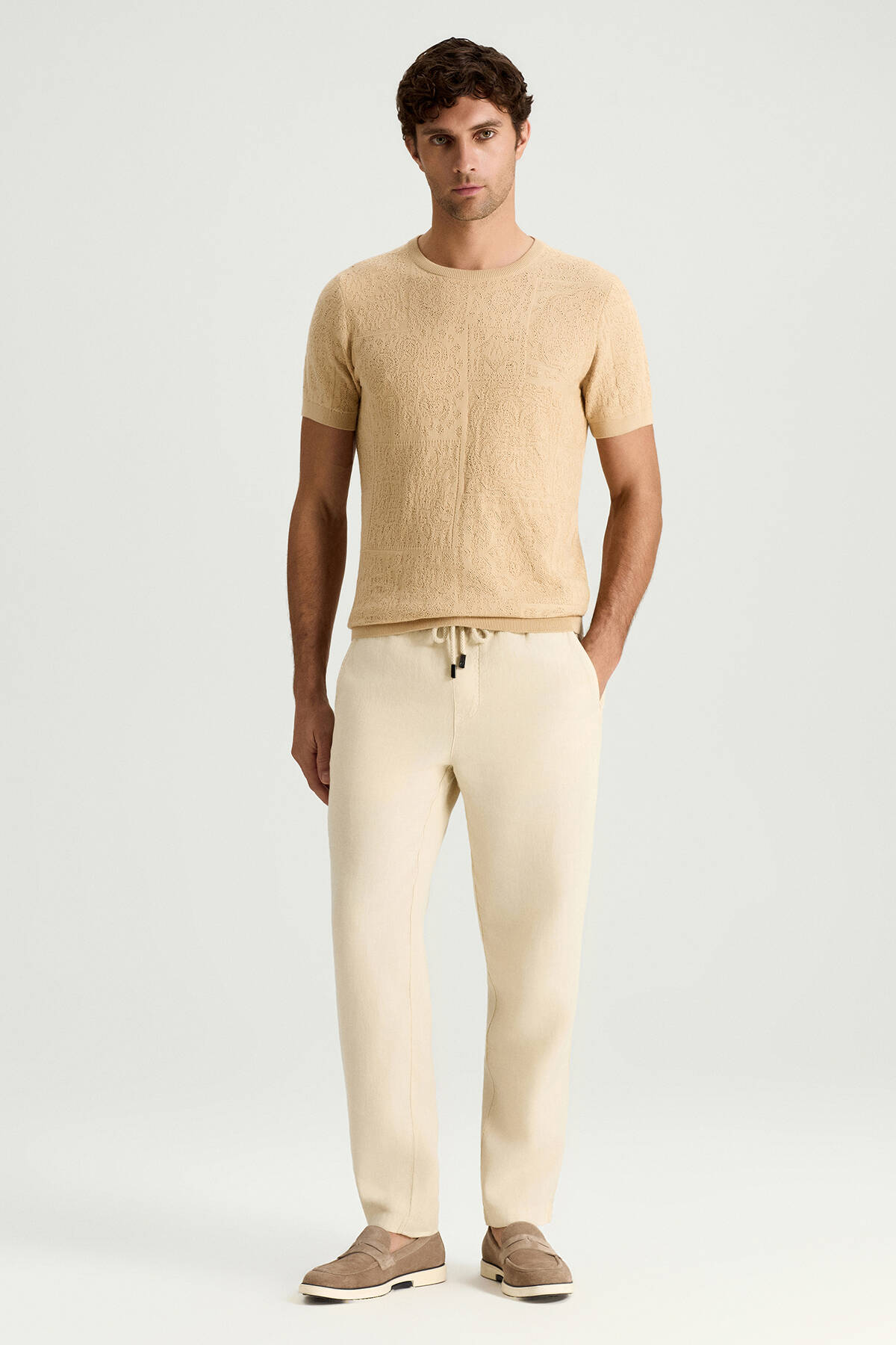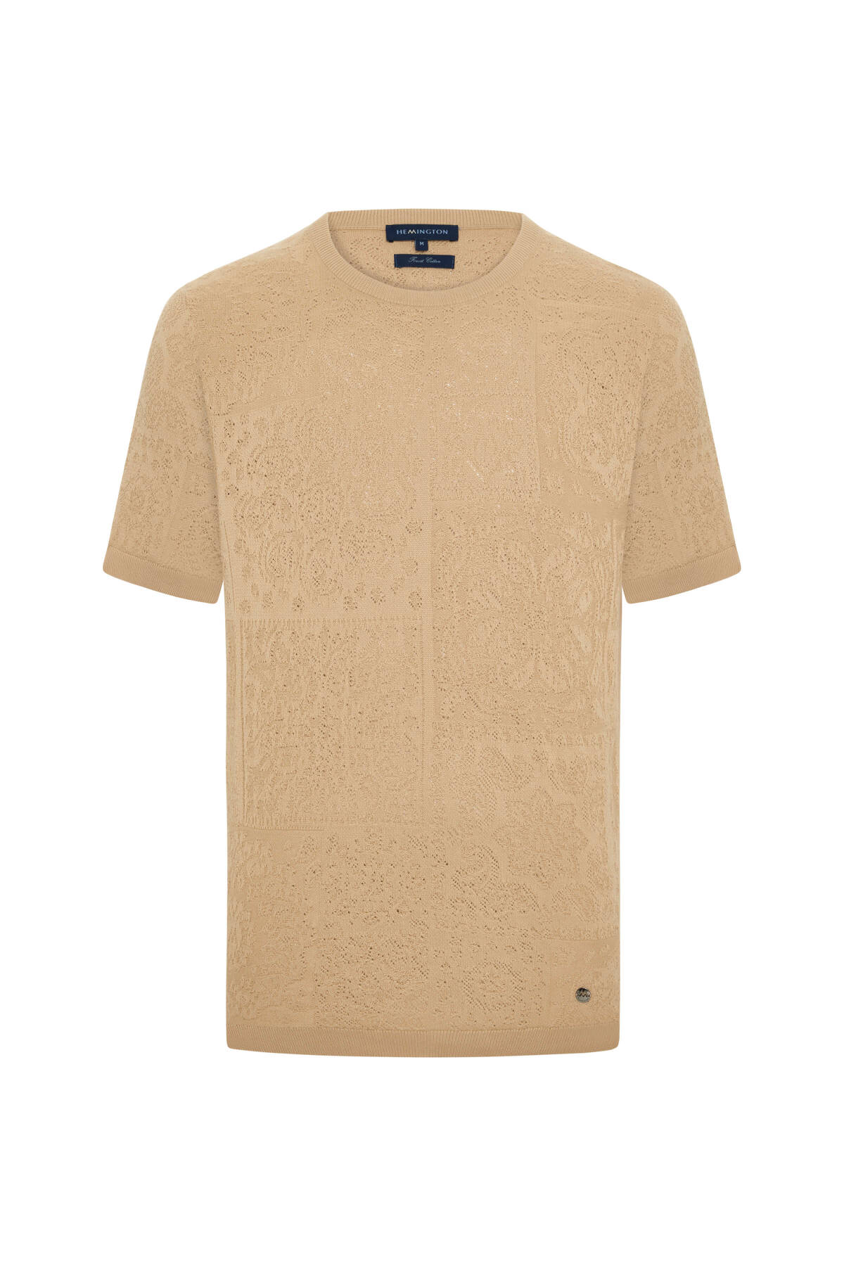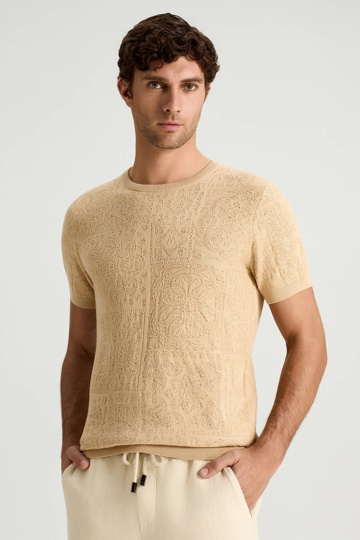 Saf Pamuk Paisley Desen Bisiklet Yaka Bej Triko T-Shirt