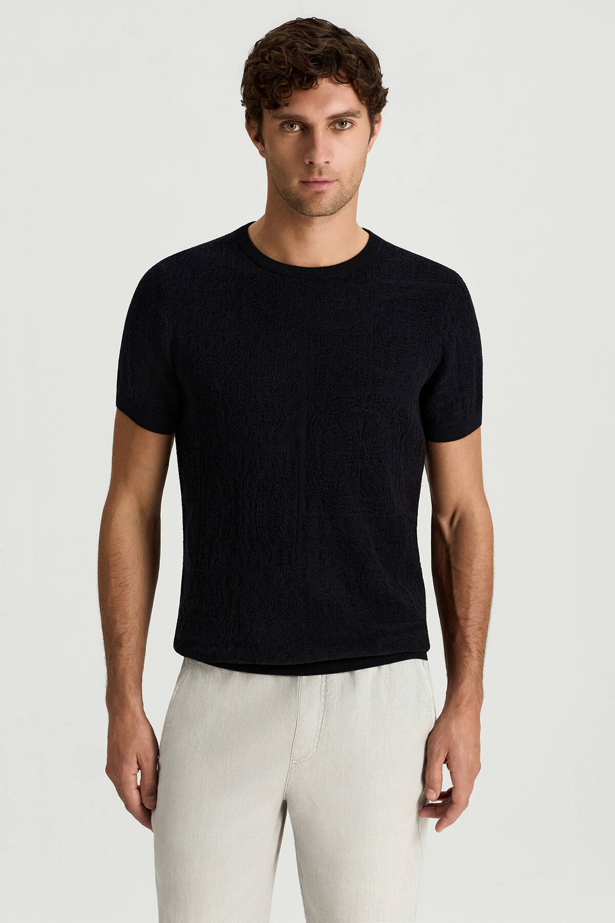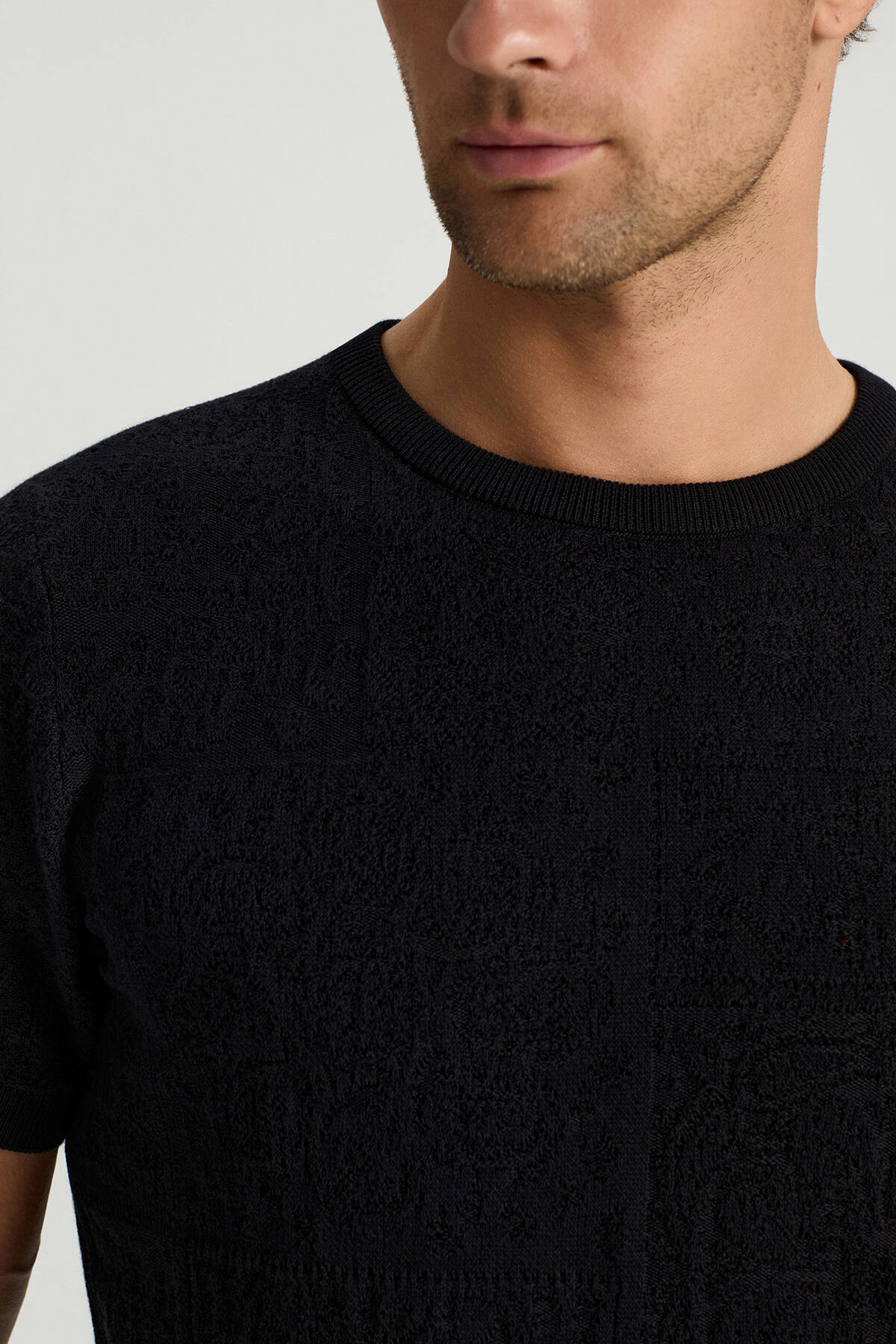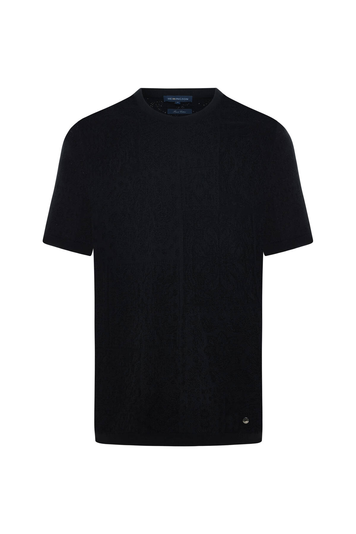 Saf Pamuk Paisley Desen Bisiklet Yaka Siyah Triko T-Shirt