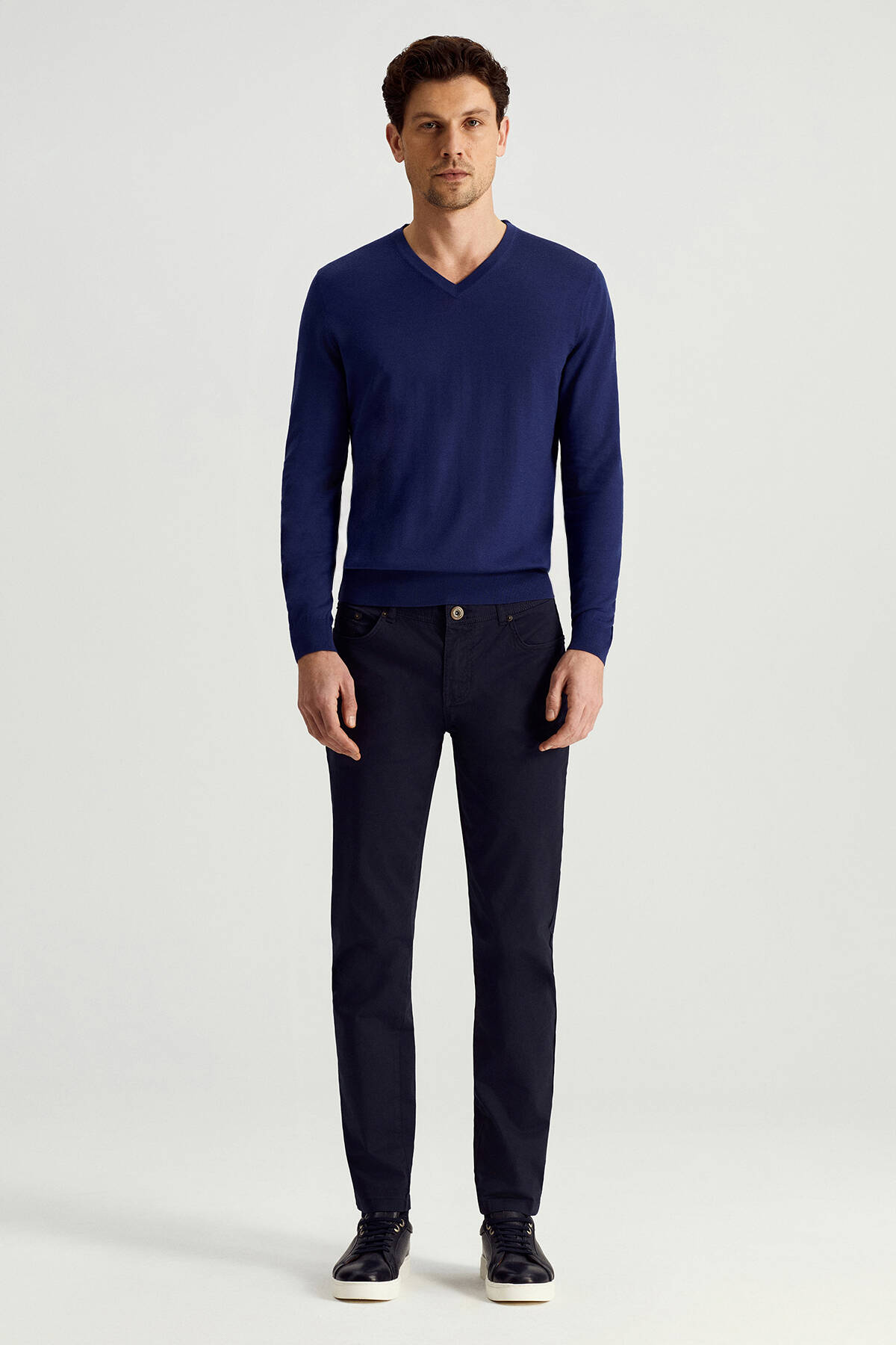 Ultrafine Merino Yünü V Yaka Mavi Triko